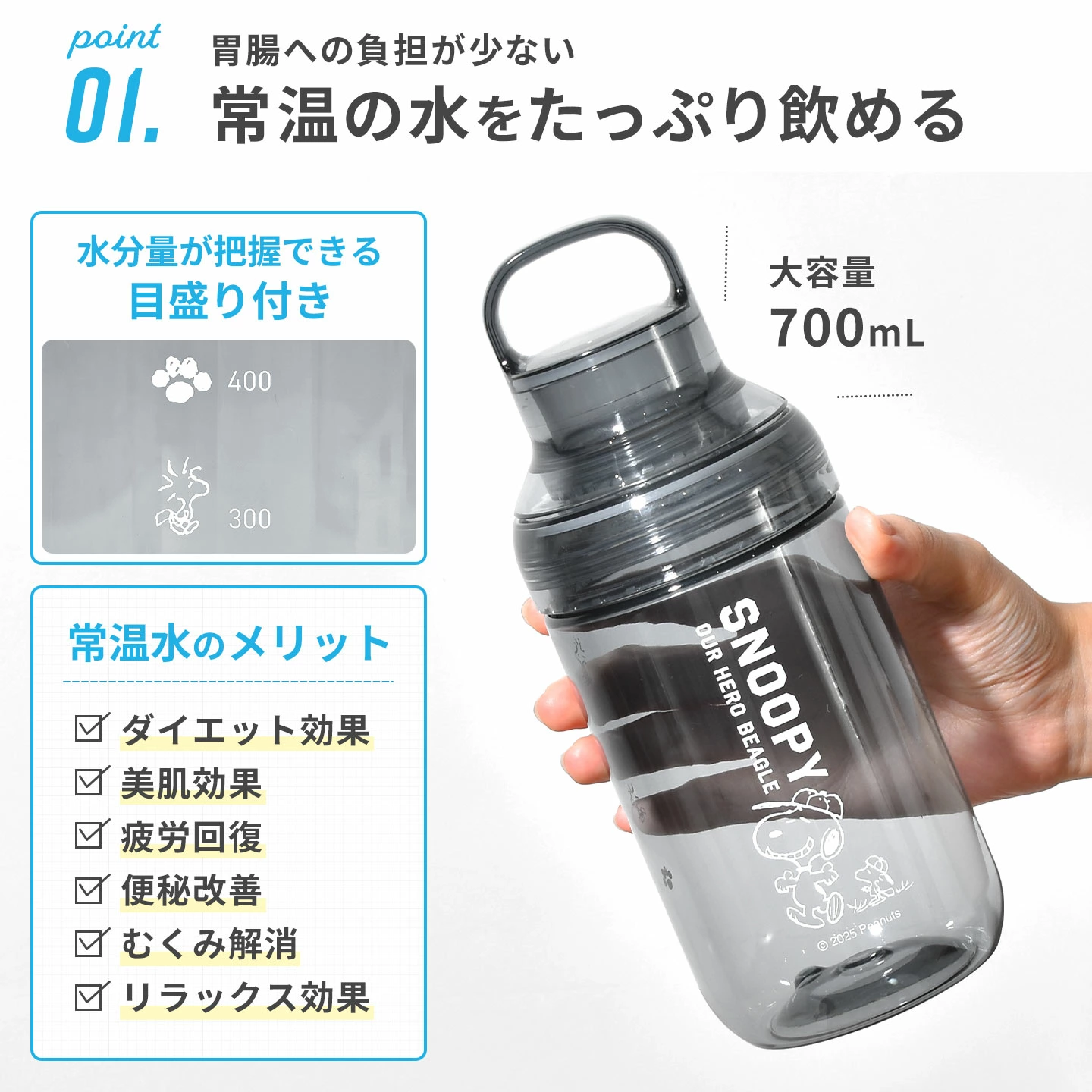 【クリアウォーターボトル700ml】スヌーピーのデザインがかわいい、クリアウォーターボトル700ml。軽くて丈夫だから持ち歩きやすく、目盛り付きでこまめな水分補給をサポートしてくれます♪ゴクゴク飲める直飲みタイプで、広口設計だから洗いやすいのも嬉しいポイント。会社や学校はもちろん、ジム・ヨガ・サウナなどの水分補給にもぴったりです!