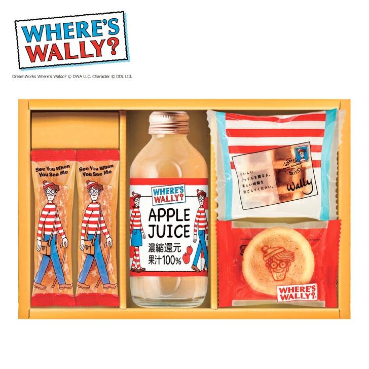 濃縮還元果汁100%ジュースと、ガレットクッキー、ショコラスティックパイ、ワッフルの詰合せ。ガレットクッキーにはウォーリーのイラストがプリントされています。