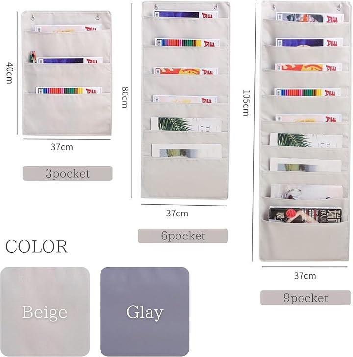 サイズ:幅37cm x 長さ40cm(3ポケット)、長さ80cm(6ポケット)、長さ105cm(9ポケット) 本体重量:約460g 素材:オックスフォード布 カラー:ベージュ グレー 用途:壁掛け収納、書類収納、小物整理 特徴:耐水性、耐荷重、環境に優しい