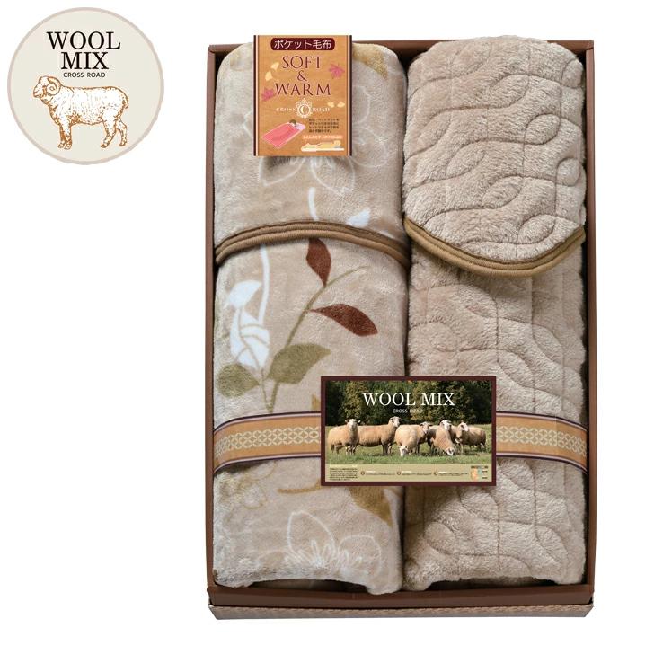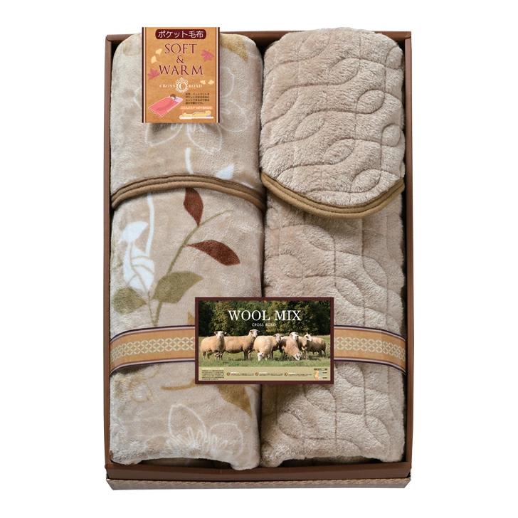 毛布=ポリエステル100%、敷パット:表地・裏地=ポリエステル100%、中綿=ポリエステル70%・ウール30%