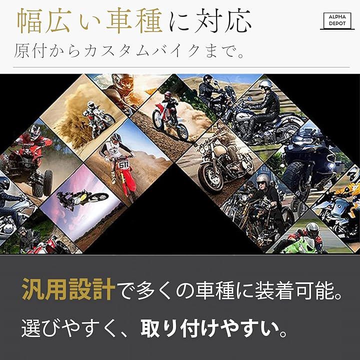 「幅広い車種に対応」汎用設計で、ヤマハ、スズキ、カワサキ、ホンダなど多くの車種に適合。オフロードバイクやスクーター、原付にも使用可能で、幅広いバイクに対応しています。