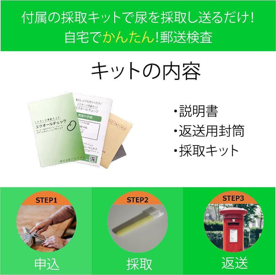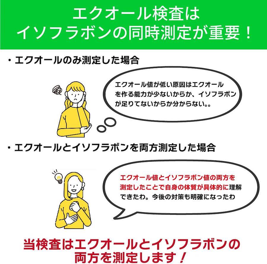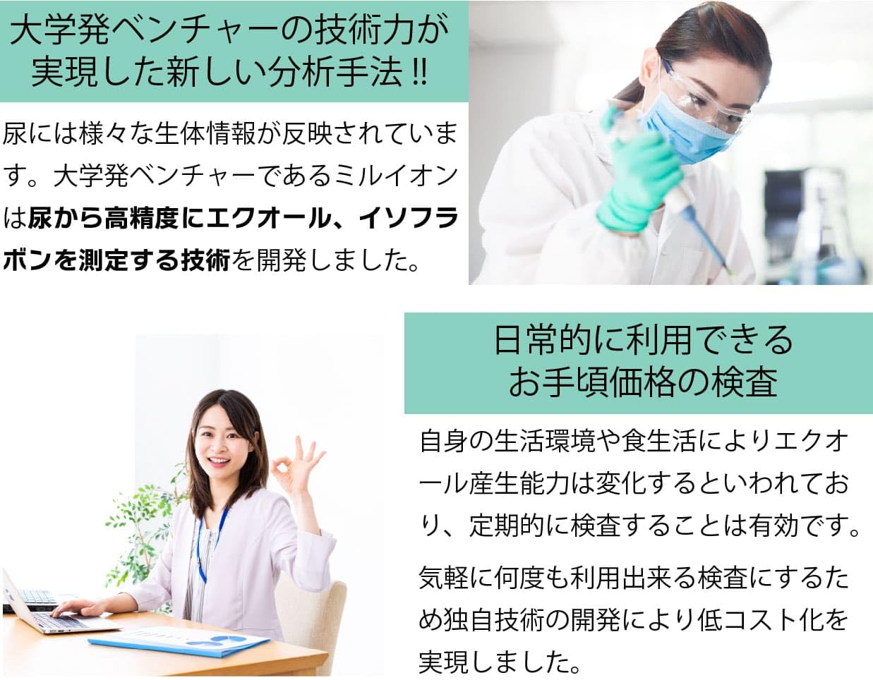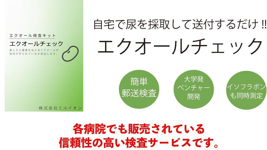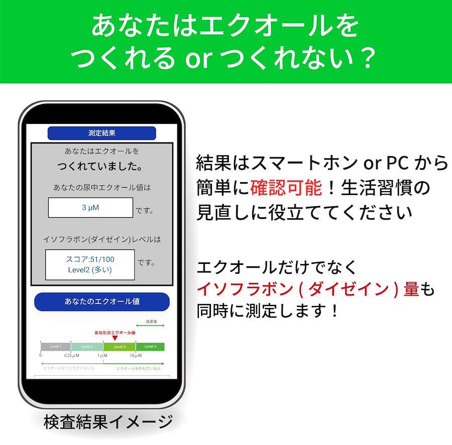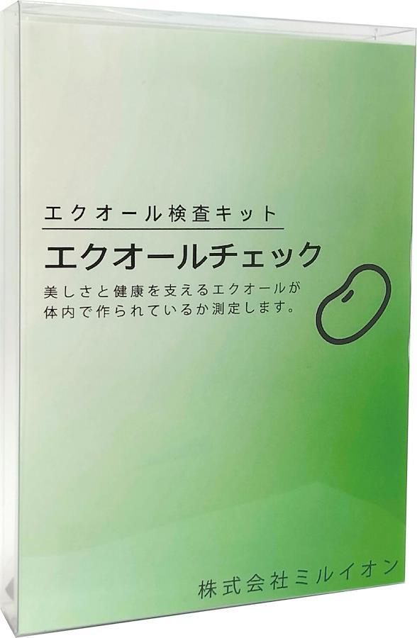 ・大豆イソフラボン由来の「エクオール」を体内でつくれているかどうかを、尿検査で簡単に調べる郵送検査キットです。 エクオールだけでなくイソフラボン(ダイゼイン)量も同時に測定します ・大学発ベンチャーのミルイオンが新たに開発したエクオールチェックは付属の採尿キットで尿を採取して送付するだけでエクオール量を測定することが出来ます!! ・安全上のお知らせ エクオールチェックは、生活習慣を見直すためのヘルスケアチェックです。 病気の診断をするものではありませんので、体調で気になることは医師にご相談ください。 検査キットが到着 キットが到着しましたら、内容物をご確認いただき、付属の採尿キットで尿を採取し付属の封筒で返送してください。約7日ほどで、結果をお届けします。 ※2週間経っても結果がお手元に届かない場合は、お手数ですがお問い合わせ下さい 原産国 日本 尿を送付するだけの簡単エクオール検査 各病院にも導入されている信頼性の高い検査です。 大学発ベンチャー提供の精密な分析サービス エクオールがつくれているか確認することが出来ます。 エクオールだけでなくイソフラボン量(ダイゼイン)も測定します。