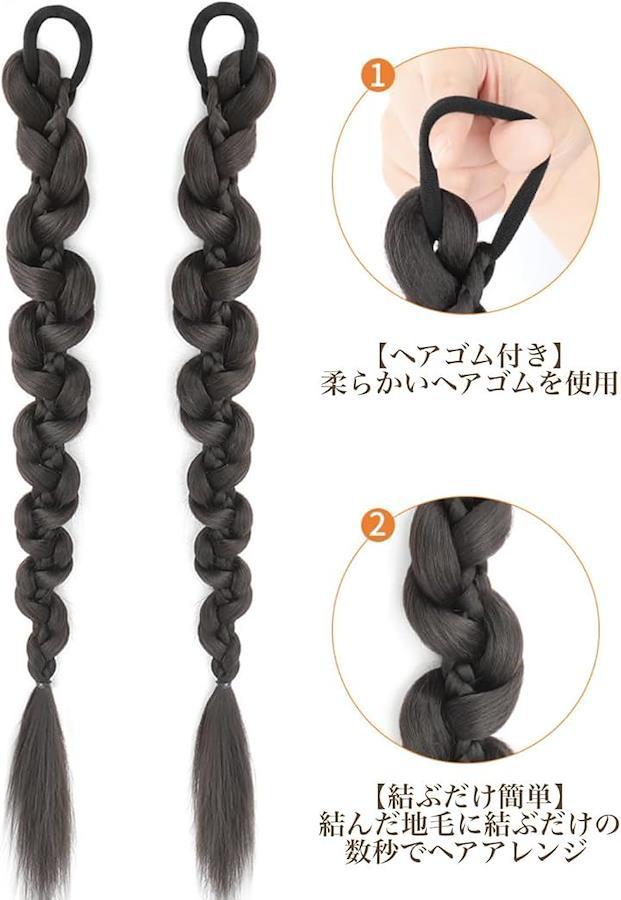 「結ぶだけ簡単」結んだ地毛に結ぶだけの数秒でヘアアレンジ・地毛と馴染みやすくショートヘア、ロングヘア、髪のボリュームが少ない方などに最適・1本のストリップとしても、2本のポニーテールとしても使用可能・とても柔らかく、お手入れも簡単