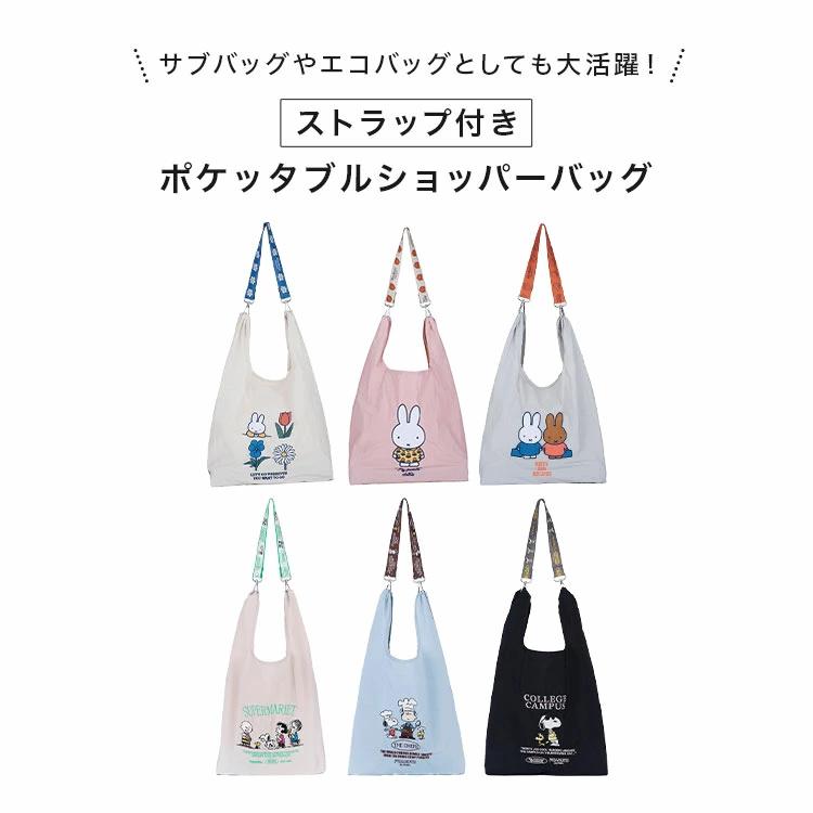 【ストラップ付き ショルダーバッグ】普段のお出かけにはもちろん、サブバッグやエコバッグとしても大活躍するポケッタブルショッパーバッグ。付属のストラップをバッグに取り付けると肩がけできる仕様になる2WAYタイプです。小さく畳んで持ち運ぶことができます。 またショルダーストラップをつけれるので、 バッグやベルトなどに取り付けることも可能。ミッフィーやスヌーピーデザインがさりげなく映える、大人可愛いデザイン♪シンプルコーデのワンポイントとしても活躍する、持つだけで気分が上がるアイテムです。