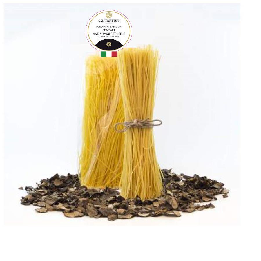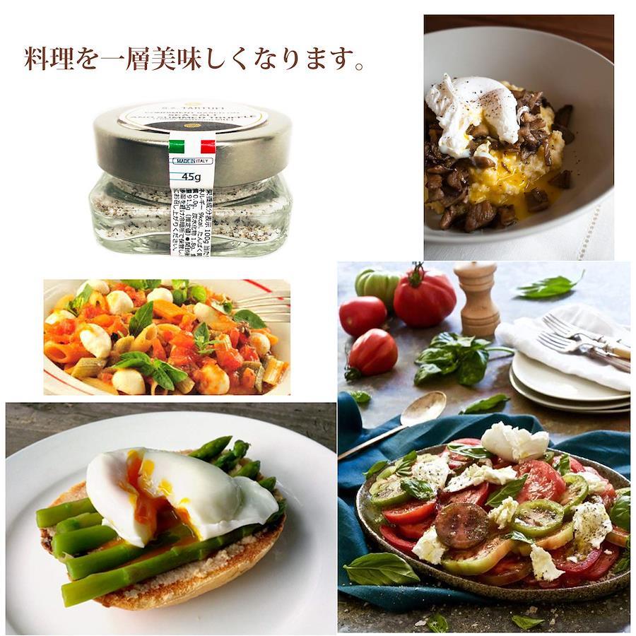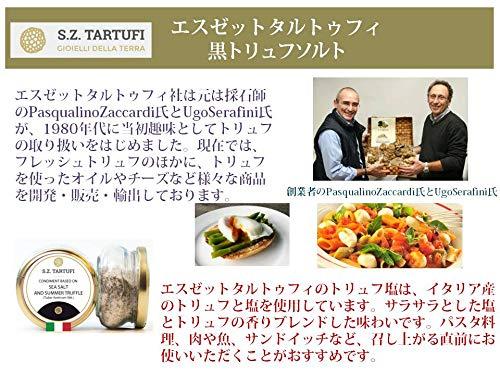 エスゼットタルトゥフィ社は元は採石師のPasqualinoZaccardi氏とUgoSerafini氏が、1980年代に当初趣味としてトリュフの取り扱いをはじめました。現在では、フレッシュトリュフのほかに、トリュフを使ったオイルやチーズなど様々な商品を開発・販売・輸出しております。エスゼットタルトゥフィのトリュフ塩は、イタリア産のトリュフと塩を使用しています。サラサラとした塩とトリュフの香りブレンドした味わいです。パスタ料理、肉や魚、サンドイッチなど、召し上がる直前にお使いいただくことがおすすめです。