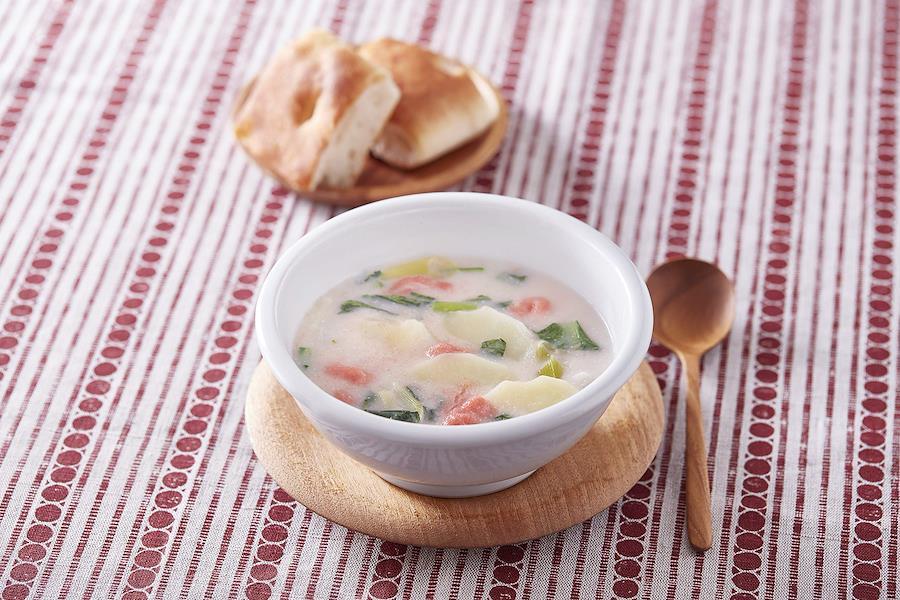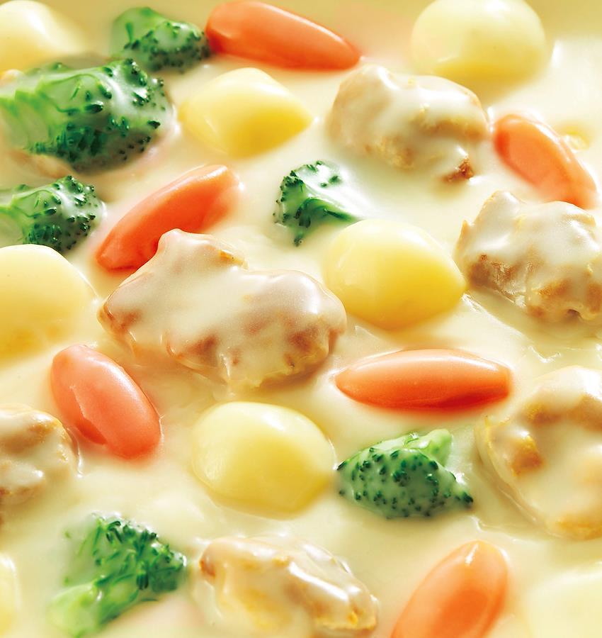 「北海道産特濃純生クリーム100%」使用した濃厚な生クリームのコクが味わえるクリームシチューです。従来の「フォン・ブラン※1」に「ブイヨン・ド・レギューム※2」を合わせることでベースのブイヨンの複合的な旨みを表現し、生クリームのおいしさを底上げしています。更に「シナモン」を使用することで、ソースのクリーム感や乳の自然な甘みを引き立てました。※1成牛・仔牛・鶏の骨と肉を煮詰めただし ※2野菜を生から煮出しただし
