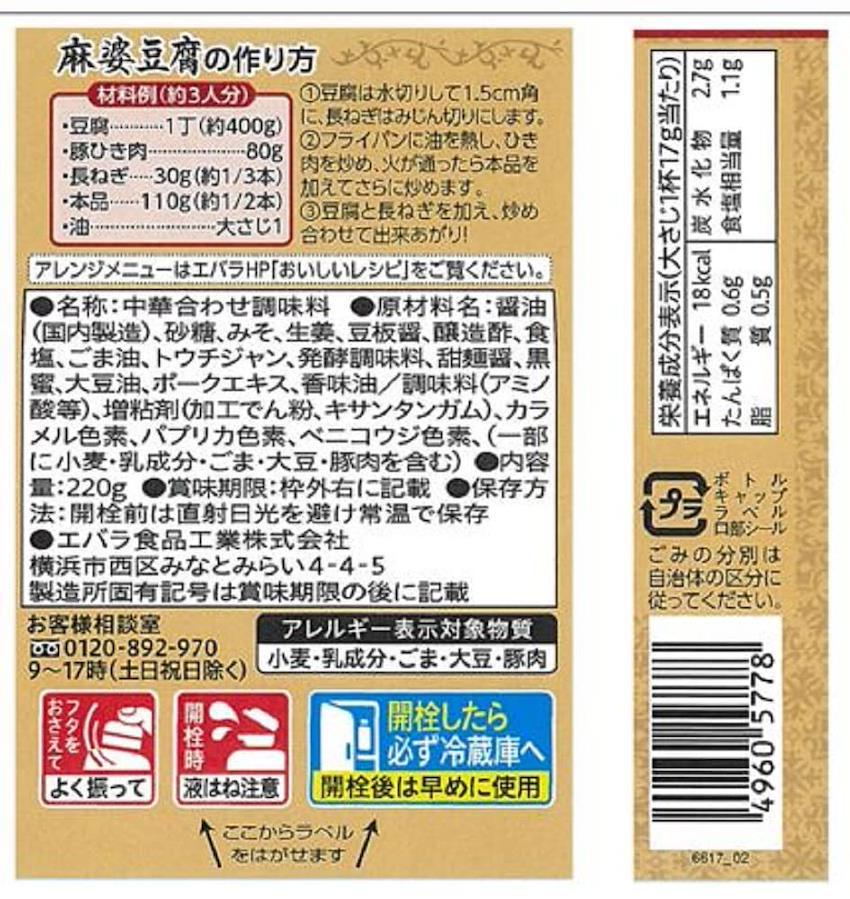 【原材料】醤油(国内製造)、砂糖、みそ、生姜、豆板醤、醸造酢、食塩、ごま油、トウチジャン、発酵調味料、甜麺醤、黒蜜、大豆油、ポークエキス、香味油/調味料(アミノ酸等)、増粘剤(加工でん粉、キサンタンガム)、カラメル色素、パプリカ色素、ベニコウジ色素、(一部に小麦・乳成分・ごま・大豆・豚肉を含む)【栄養成分】大さじ1杯17g当たりエネルギー(kcal)18、たんぱく質(g)0.6、脂質(g)0.5、炭水化物(g)2.7、食塩相当量(g)1.1【アレルゲン】小麦、乳成分、ごま、大豆、豚肉