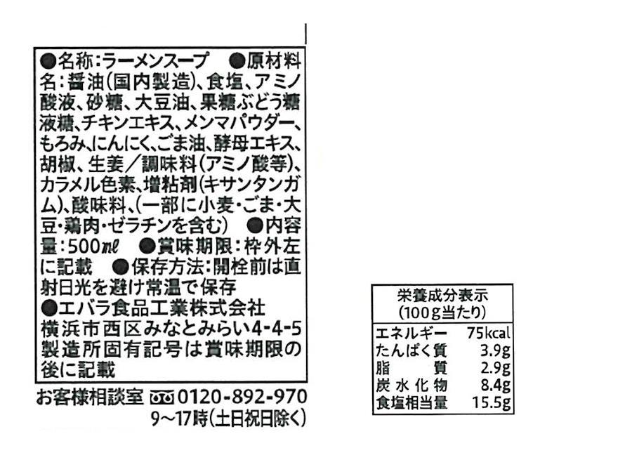 【原材料】醤油(国内製造)、食塩、アミノ酸液、砂糖、大豆油、果糖ぶどう糖液糖、チキンエキス、メンマパウダー、もろみ、にんにく、ごま油、酵母エキス、胡椒、生姜/調味料(アミノ酸等)、カラメル色素、増粘剤(キサンタンガム)、酸味料、(一部に小麦・ごま・大豆・鶏肉・ゼラチンを含む)【栄養成分】100g当たりエネルギー(kcal)75、たんぱく質(g)3.9、脂質(g)2.9、炭水化物(g)8.4、食塩相当量(g)15.5【アレルゲン】小麦、ごま、大豆、鶏肉、ゼラチン