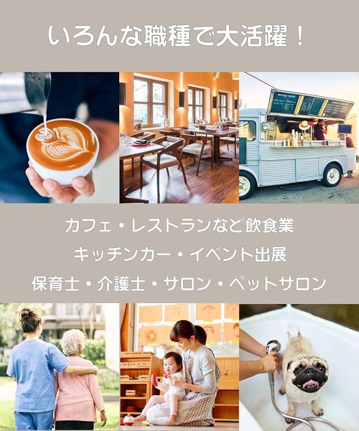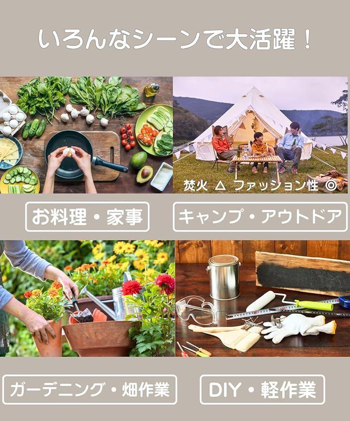 物の出し入れがスムーズに行えるため、キッチン、ガーデニングだけでなく保育士、サロン、カフェ店員など多様なシーンで活躍します。