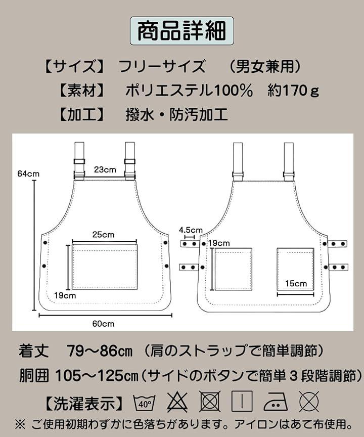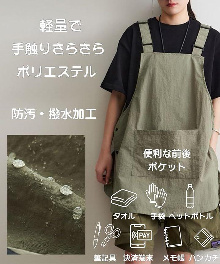 「こんな方におすすめ」 ・飲食店・カフェ・バリスタなどの接客業の方 ・キッチンカーやイベント出展の方 ・サロンやペットサロンスタッフ、保育士、介護士の方 ・家庭での料理や掃除、DIYを快適にしたい方 ・おしゃれで機能的なエプロンを探している方 サイズ フリーサイズ(男女兼用) 素材 ポリエステル100% 約170g 加工 撥水・防汚加工 中国製