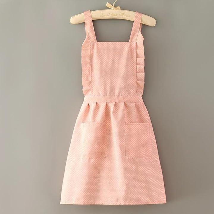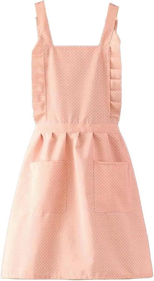 胸当てがついたエプロンドレス、ピナフォアとも呼ばれるワンピース型で、肩紐にフリルがついます。