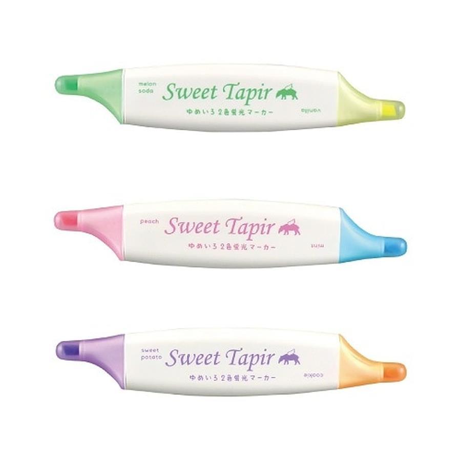 メロンソーダ&バニラ/ピーチ&ミント/スイートポテト&クッキーの香り。薄くて持ちやすい、バク型の甘い香り付きふんわり蛍光マーカー3本セット。ペン先の方向が分かりやすく、まっすぐな線がひきやすい
