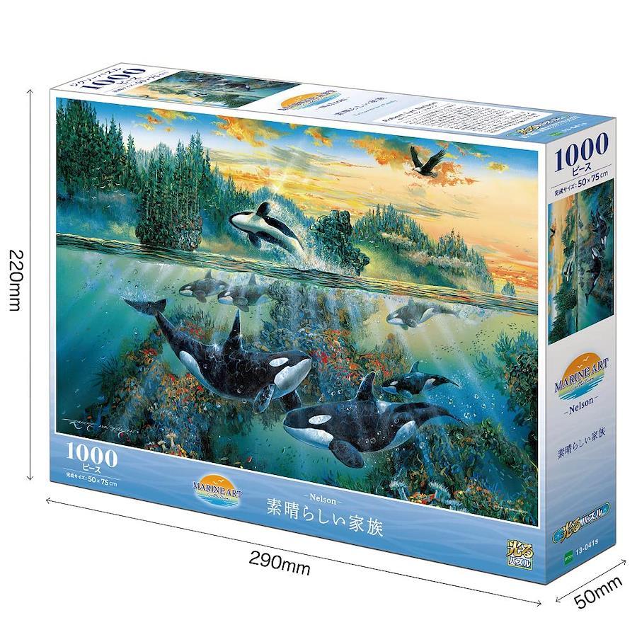 マリンアーティストの先駆者で巨匠と言われるロバート・リン・ネルソンの大作がジグソーパズルで登場! 独自の作風で、自然界を悠然と生きるシャチの魅力を余すところなく描いています。 重厚感のある芸術的なタッチの作品なので、お部屋に飾ればアートギャラリーのような気分に浸れます。 1000ピースは気軽に楽しめて飾り応えも抜群です。 パズル表面には蓄光インクを印刷しているので、完成後は幻想的に光ります。 パズルのり・ヘラ付き