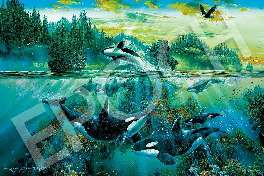 マリンアーティストの先駆者で巨匠と言われるロバート・リン・ネルソンの大作がジグソーパズルで登場! 独自の作風で、自然界を悠然と生きるシャチの魅力を余すところなく描いています。 重厚感のある芸術的なタッチの作品なので、お部屋に飾ればアートギャラリーのような気分に浸れます。 1000ピースは気軽に楽しめて飾り応えも抜群です。 パズル表面には蓄光インクを印刷しているので、完成後は幻想的に光ります。 パズルのり・ヘラ付き