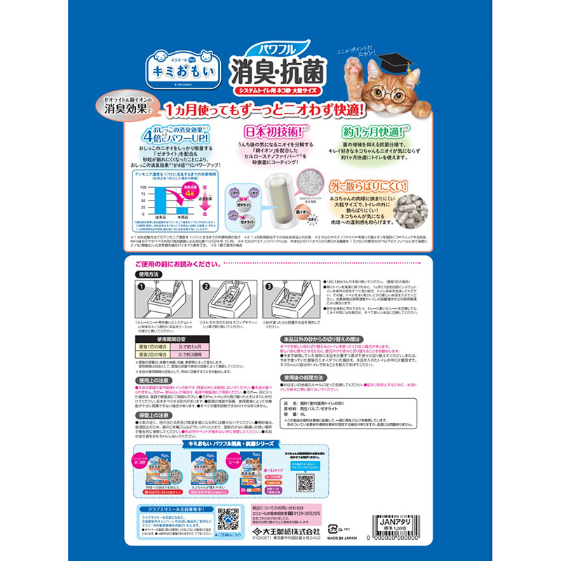 ・消臭効果がパワーアップし、1ヵ月使ってもずーっとニオわず快適!・ゼオライトと銅イオンのW消臭パワーでニオイを吸着&分解して消臭効果が長続き。おしっこへの消臭効果が従来品比4倍にアップ。・日本初技術!銅イオン配合のCNFコーティングでうんち臭をしっかり消臭。・菌の繁殖を抑える抗菌仕様。・粒崩れを改善し1ヵ月後も砂粒がボロボロにならずお掃除時も快適。・各社システムトイレに使用可能・交換目安1ヵ月・大粒サイズでネコちゃんの肉球に挟まりにくく、トイレの外に散らばりにくい!ネコちゃんが気になる肉球への違和感も和らげます。