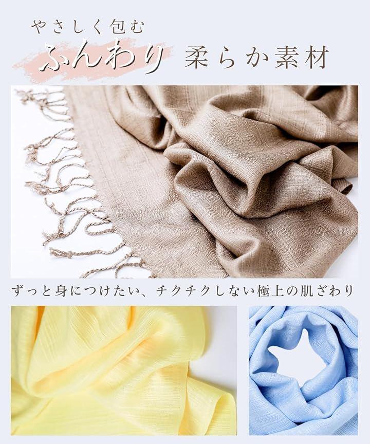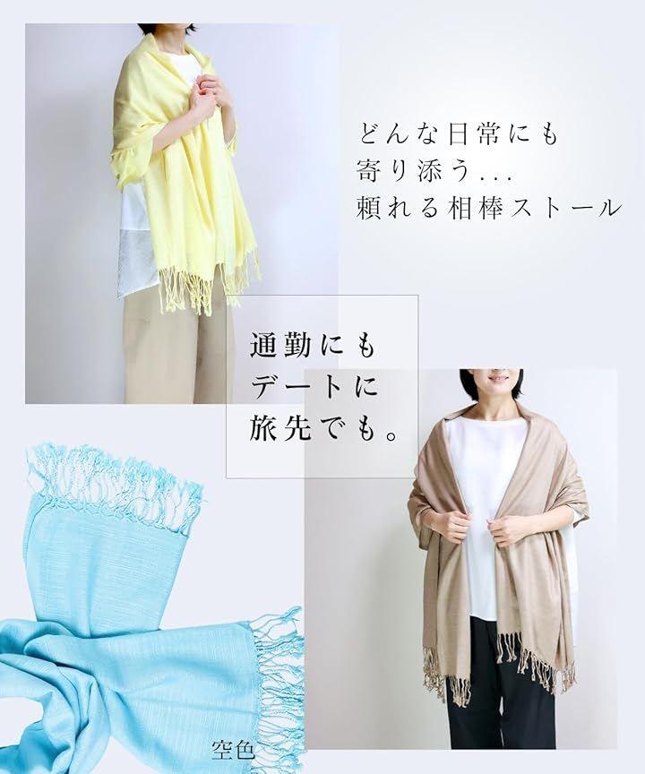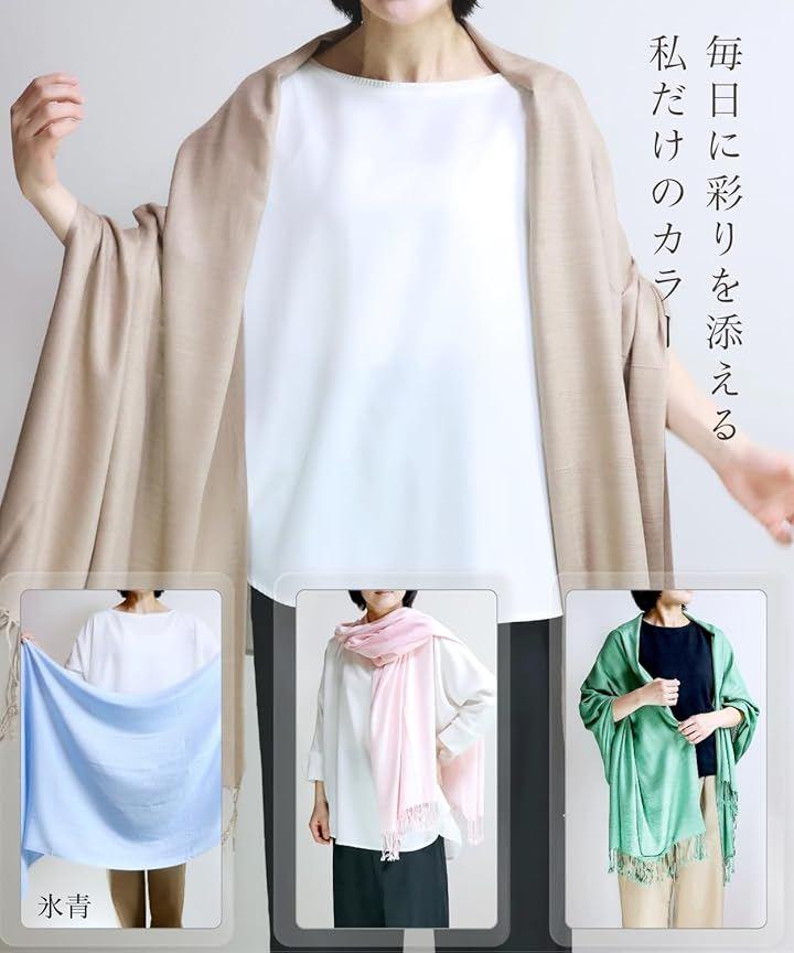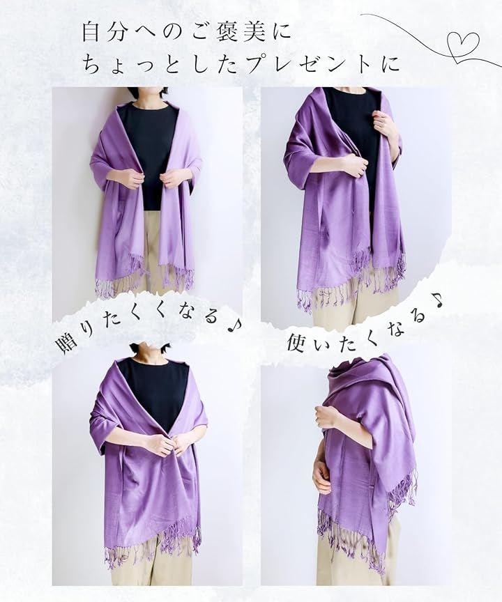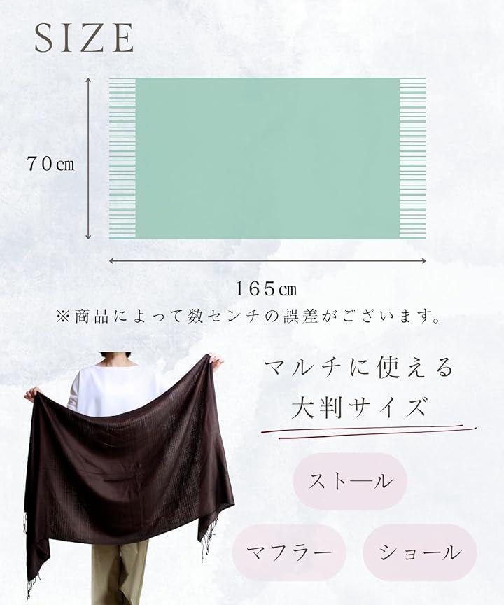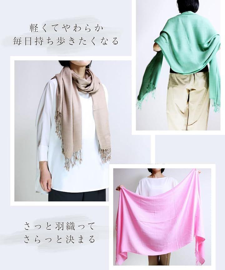「オールシーズン使えて、1枚で何通りも楽しめるマルチアイテム」 ストール、ショール、羽織りとして、首もとが寂しい時は襟巻き・スカーフとしてワンポイントに、肌寒い時にはマフラーやひざ掛けとして防寒にもなります。