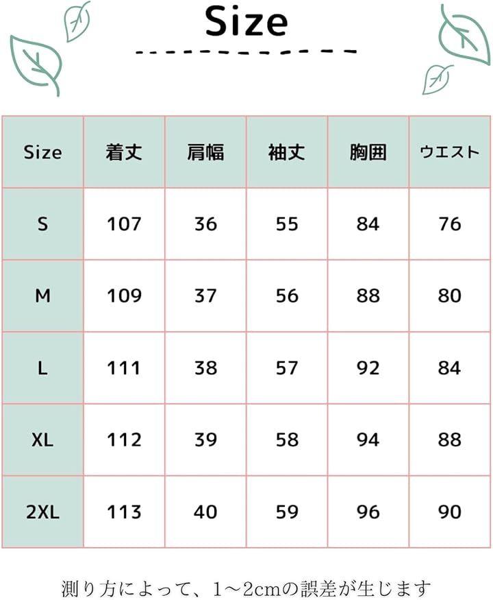 《S》着丈:107, 肩幅:36, 胸囲:84,ウエスト76,袖丈:55 《M》着丈:109, 肩幅:37, 胸囲:88,ウエスト80,袖丈:56 《L》着丈:111, 肩幅:38, 胸囲:92,ウエスト84, 袖丈:57 《XL》着丈:112, 肩幅:39, 胸囲:94,ウエスト88, 袖丈:58 《2XL》着丈:113, 肩幅:40, 胸囲:96,ウエスト90, 袖丈:59