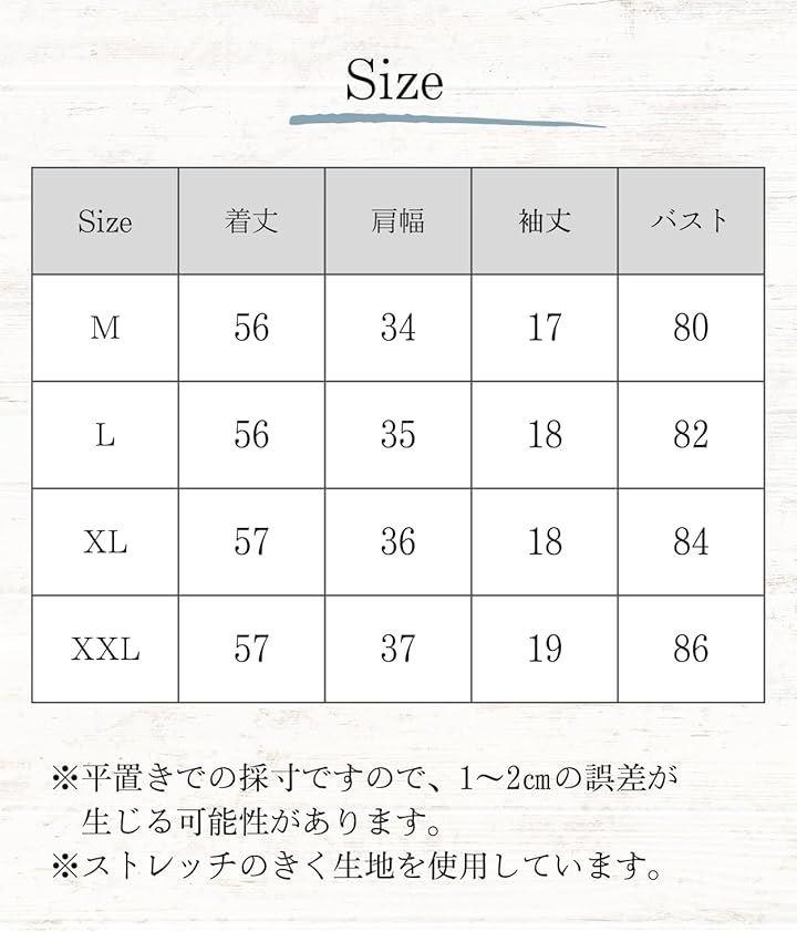 「サイズ」M:着丈56、肩幅34、袖丈17、バスト80 L:着丈56、肩幅35、袖丈18、バスト82 XL:着丈57、肩幅36、袖丈18、バスト84 XXL:着丈57、肩幅37、袖丈19、バスト86 4サイズ展開で大きいサイズまで幅広く対応しています。