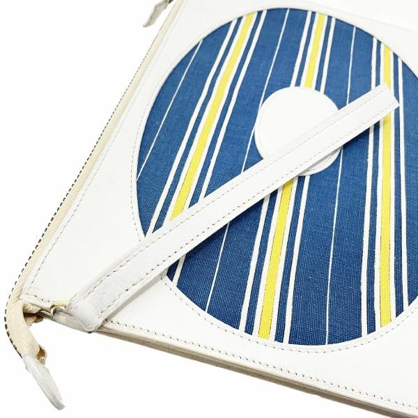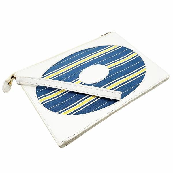 外側:レザー部分は所々に傷・擦れ・擦り減り・クスミ・シワ・汚れ等があり、縁周りには擦り減り・擦れ汚れ等がございます。特に、ストラップ付け根部分は擦り減り・縁コーティングの剥がれ・ひび割れ等ダメージが生じています。また、ファスナー周り生地にも擦り減り・黄ばみ変色があり、ファスナーエンド縁には擦り切れがございます。金具には擦り傷・クスミ・メッキ剥がれ等が見られます。ファブリック地は擦れ・多少色褪せ等がありますが、目立つ汚れ等はございません。