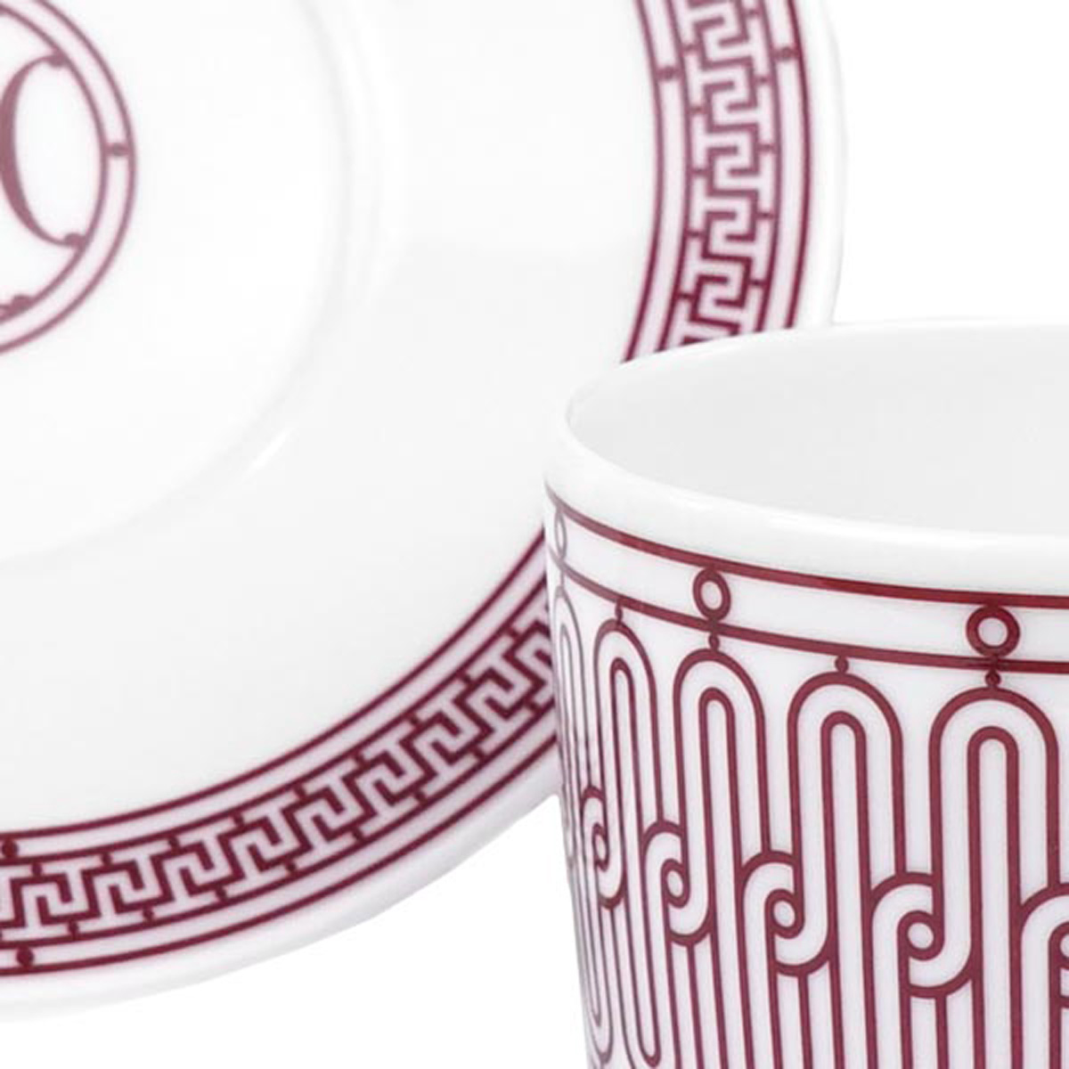 イニシャルの「H」を2つ重ねたモチーフを中央に配し、周辺には白と赤の幾何学模様の装飾が施された、パリらしいデザインのティーセットです。