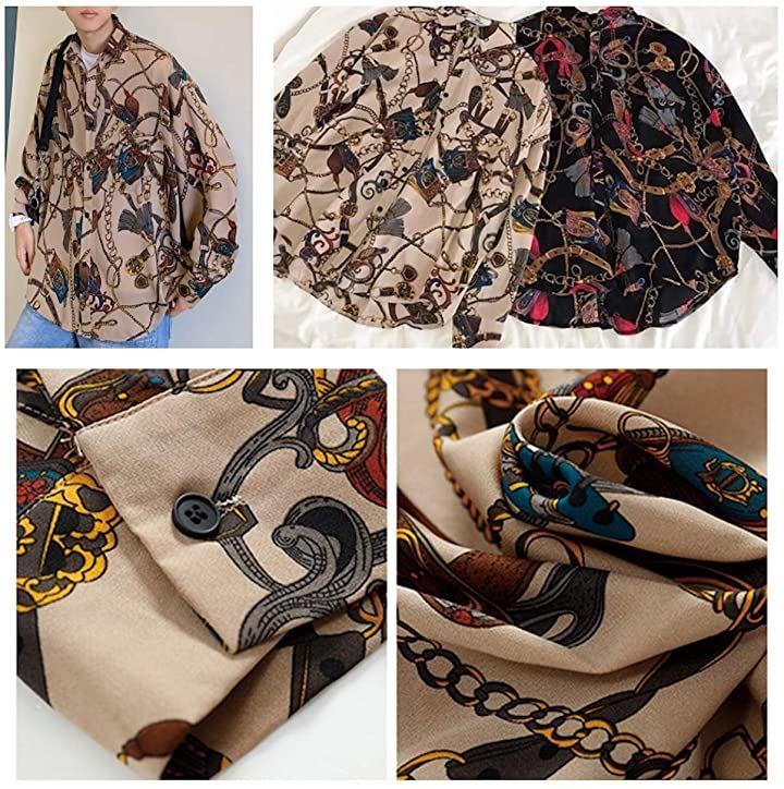 ・「デザイン」・大胆にプリントされたチェーン柄・トレンドのドロップショルダー(肩落ち)デザイン・身幅、肩幅にたっぷりと余裕を持たせたドロップショルダーで、ざっくりとしたサイズ感が魅力・ゆったりとしたルーズシルエットですが、上品な着こなしを演出する絶妙なゆるさ
