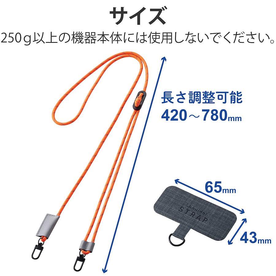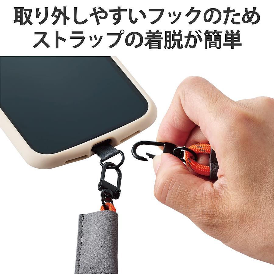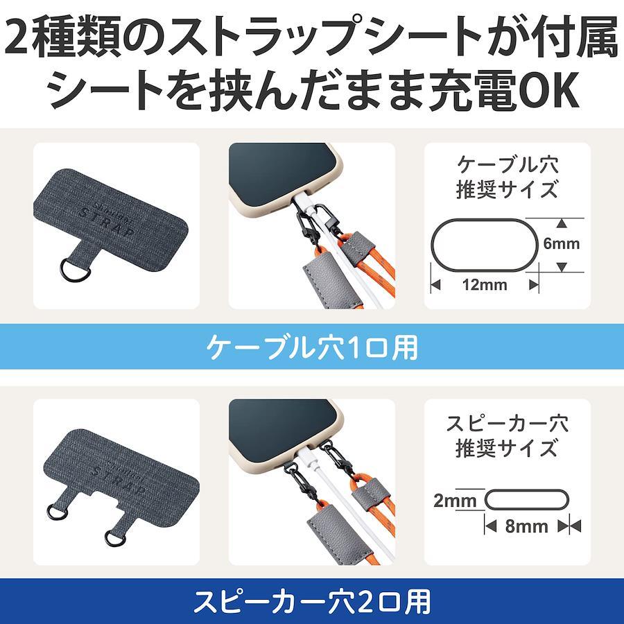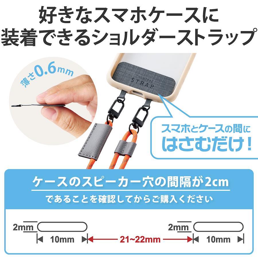 ●肩から掛けられ、バッグやポケットから取り出さなくてもすぐにスマートフォンの操作ができるショルダーストラップです。●両手があいて、普段のお出かけはもちろん、お仕事や旅行などのイベント時にも活躍します。●落下、盗難、紛失防止にもなります。●取り外しやすいフックを使用しているので、ストラップの着脱が簡単にできます。●ストラップは調節パーツでお好みの長さにできます。●耐久性の高い素材の丸ひもを採用しているので、カジュアルやアウトドアなどのアクティブな装いに合わせやすいデザインです。●ストラップの縫製部分はソフトレザー素材のパーツで保護して強度を高めています。●ケースにストラップホールがなくても、付属のストラップシートをスマートフォンとケースの間に挟むだけで使用でき、取り外しも簡単です。●ケーブル穴1口用とスピーカー穴2口用の2種類のストラップシートが付属しているので、どちらのタイプのケースにも使用できます。●ストラップシートはスマートフォンやケースを傷つけにくい柔らかい素材を使用しています。●ケースにフィットする0.6mmの薄型のストラップシートで簡単に装着できます。