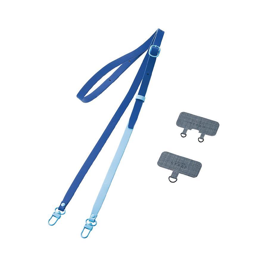 【 仕様 】セット内容:ショルダーストラップ、ストラップシート(1口/2口)各1枚サイズ:ショルダーストラップ:全長約530~650mm、ストラップシート:W65mm×D0.6mm×H43mm材質:ポリエステル、亜鉛合金、PUカラー:ブルー耐荷重:2.5kgまで ※250g以上の機器本体には使用しないでください。
