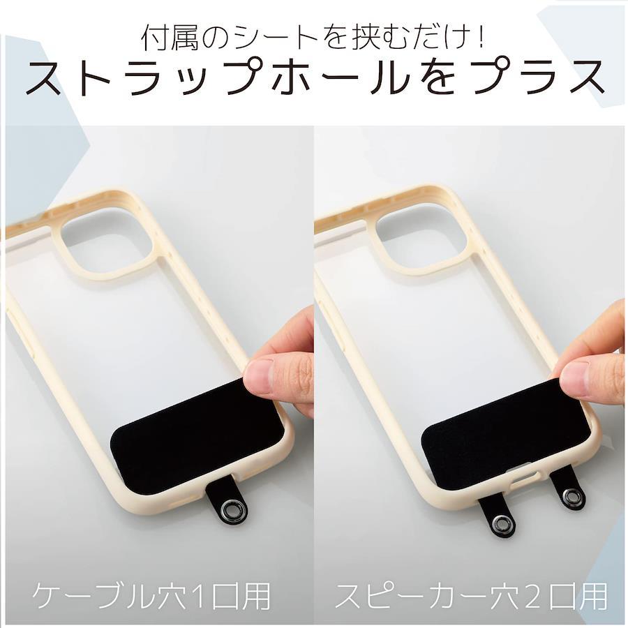■ケースにストラップホールがなくても、付属のストラップホールシートをスマートフォンとケースの間に挟むだけで使用でき、取り外しも簡単です。