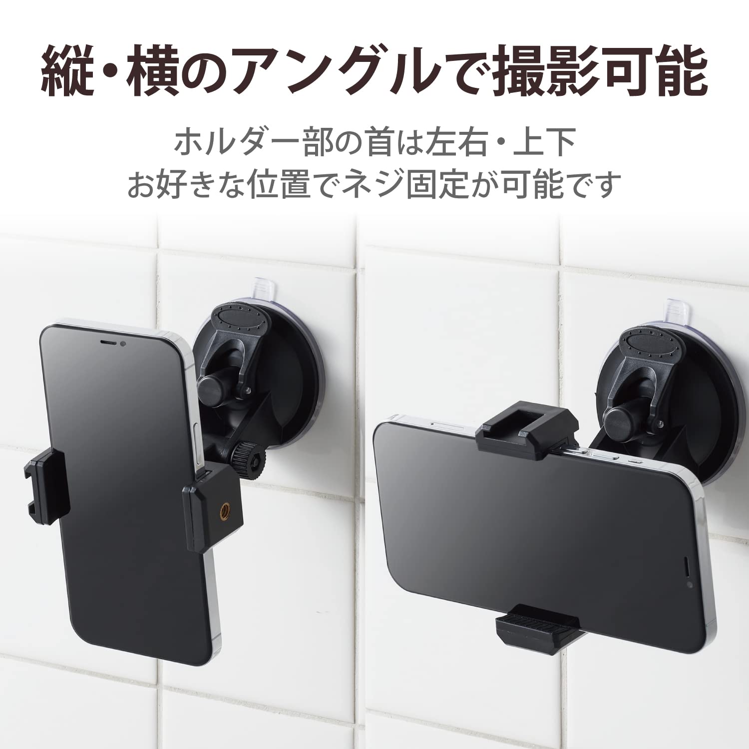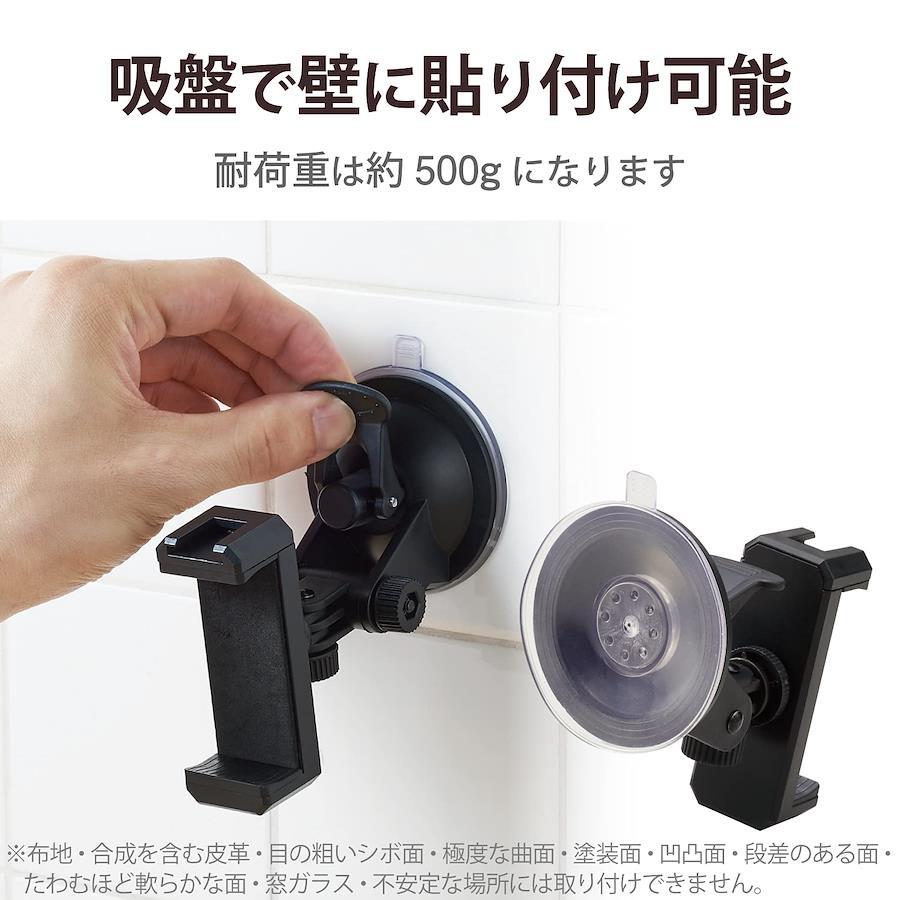 【 説明 】■ 壁に貼り付けて手元の定点撮影などが可能な、吸盤タイプのスマートフォンホルダーです。■ 吸盤で壁に貼り付けることが可能です。※ 次のような場所に本製品は取り付けできません。布地・合成を含む皮革・目の粗いシボ面・極度な曲面・塗装面・凹凸面・段差のある面・たわむほど軟らかな面・窓ガラス・不安定な場所。※ 耐荷重は約500g以上の荷重をかけないでください。※本製品を逆さの状態で取り付けないでください。■ アクセサリーシューが付いているのでマイクやライトなどのアクセサリーの取り付けが可能です。■ スマートフォンホルダーは6.5インチまでの大きさに対応しています。■ 縦撮り、横撮りに対応します。