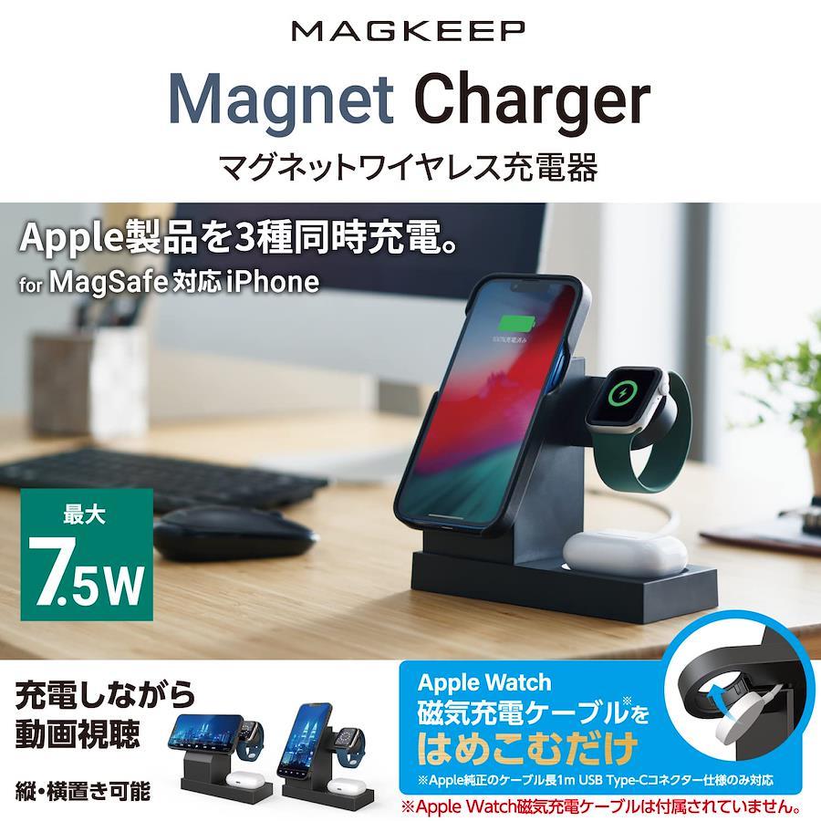 ■対応機種:マグネット部:MagSafe規格対応iPhoneシリーズ、台座部:ワイヤレス充電に対応したAirPodsシリーズ、Apple Watchホルダー部:Apple Watchシリーズ(Apple Watch磁気充電ケーブルをはめ込んだ場合)