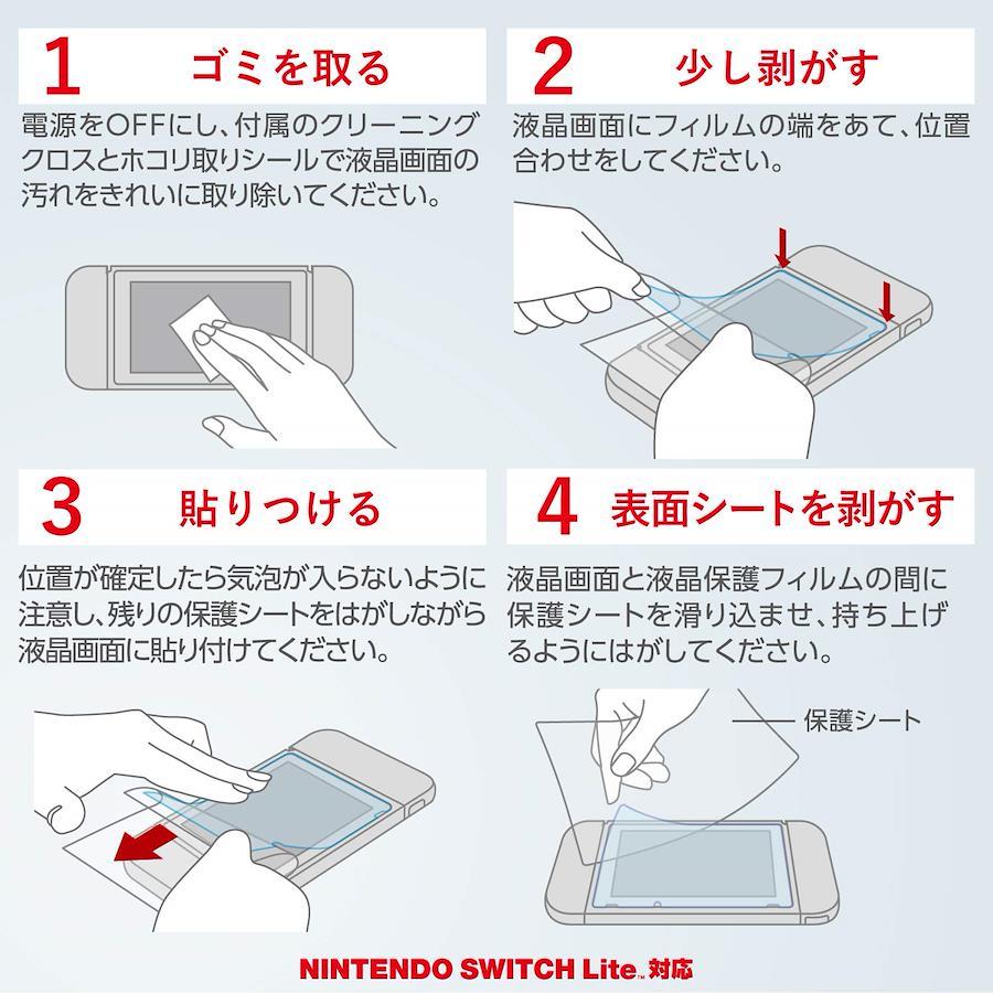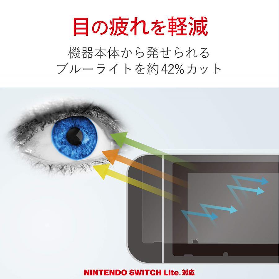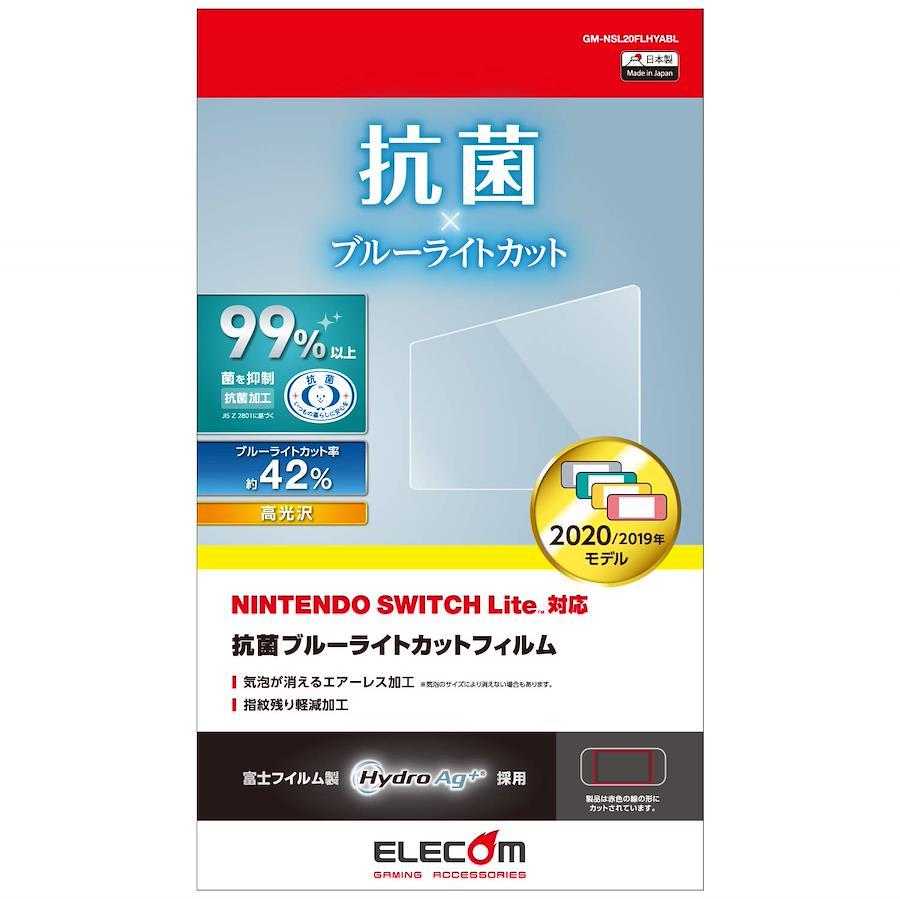 【 説明 】■ NINTENDO SWITCH(TM)Liteの液晶画面をキズや汚れから守る、抗菌・抗ウイルス、ブルーライトカット、衝撃吸収タイプの液晶保護フィルムです。■ フィルム表面に抗菌・抗ウイルス能力の高い富士フイルム特殊抗菌技術Hydro Ag+(R)コーティングを施しています。■ 内部の抗菌剤から銀イオンが拡散するため、表面だけの抗菌コートと比べて効果が長持ちします。■ こちらの製品は表面上における細菌の増殖を抑制、あるいは阻害する性能を有したもので、財団法人日本規格協会(JSA)が定める抗菌性試験に準拠したものです。■ こちらの製品はウイルスの活動を抑制する性能を有したもので、国際標準化機構(ISO)が定める抗ウイルス性試験に準拠したものです。■ LED液晶ディスプレイが発する光の中の青い部分「ブルーライト」を約42%カットする液晶保護フィルムです。※ ブルーライトは目の角膜や水晶体で吸収されずに網膜まで到達し、網膜の機能低下を引き起こす場合があると言われています。■ ブルーライトを効率的にカットするだけでなく、色調をできるだけ変えずに自然に見えるようなクリアタイプのフィルムを採用しています。■ 液晶画面へのダメージを衝撃吸収層が吸収し保護します。■ つやのある高光沢加工により、画像の輪郭がくっきり見える高光沢タイプです。■ 指紋汚れが目立ちにくい指紋軽減加工を施しています。■ 時間の経過とともに気泡が目立たなくなる特殊吸着層を採用したエアレスタイプです。■ 小さな気泡ができたときには、指などで押し出すことで気泡を抜くことができます。■ 表面硬度3Hのハードコート加工により、フィルム表面のキズを防止します。※表面硬度は実力値です■ フィルムを貼ったままでも本体操作ができるタッチスクリーン入力に対応しています。■ 貼り付け面にシリコン皮膜をコーティングし、接着剤や両面テープを使わずに貼り付け可能な自己吸着タイプです。貼りやすく、貼り直しも可能です。■ 端末の形状に合わせたサイズにカット済みなので、パッケージから取り出してすぐに使用可能です。■ フィルムがキレイに貼れる、クリーニングクロス、ホコリ取りシールが付属しています。