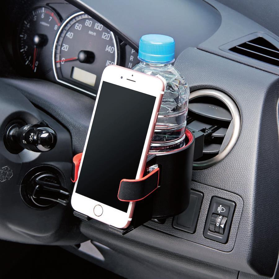 車内でスマートフォンとドリンクを一緒に設置できるエアコン吹出口取付けタイプのドリンクホルダーです。
