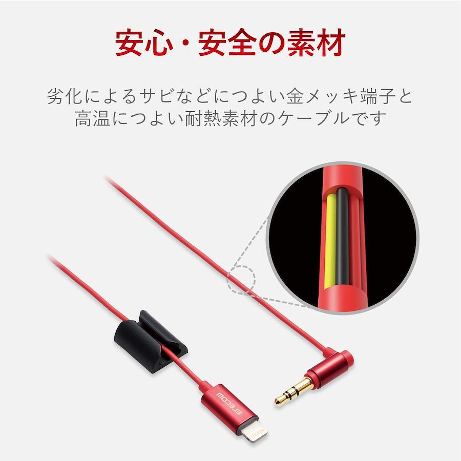 【 説明 】■ iPhoneやiPadなどのLightningコネクタ搭載機器と、カーオーディオのAUX端子を接続することで、手軽に音楽を楽しめる車載用オーディオケーブルです。■ 耐熱素材を採用しており、高温になる車内でも安心してご使用いただけます。■ 接触抵抗が小さく、経年劣化によるサビなどに強い金メッキ仕上げの端子です。■ 信号劣化の少ないOFC99.99%(無酸素銅)ケーブルを採用しています。信号の歪みや伝送ロスを抑えることができ、キレのある音質を再現できます。■ Appleの正規ライセンス「Made for iPhone/iPad」を取得した製品です。アップデートにも対応しているので、安心してお使いいただけます。■ 未接続時にケーブルを固定できるケーブルホルダーが付属しています。ケーブルホルダーは付属の両面テープでお好みの場所に取り付け可能です。■ iPhoneやiPadのケースに干渉しにくい小型コネクタを採用しています。■ iPhoneなどの機器接続側には、厚みのあるケースなどを装着していても接続できるストレートプラグを採用しています。■ スピーカーなどへの接続側には、コンパクトに接続できるL型プラグを採用しています。■ パウダーを混ぜた特殊光沢塗装で、高級感のある外観に仕上げています。
