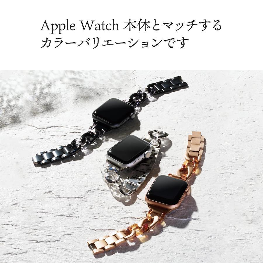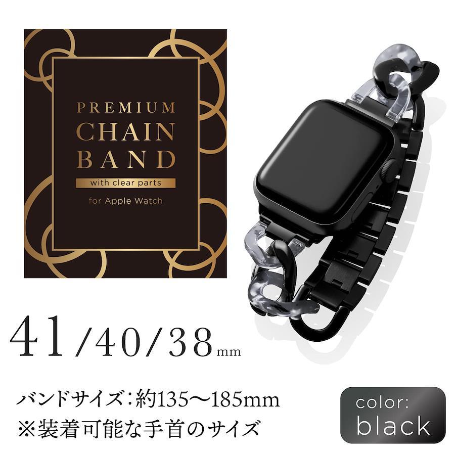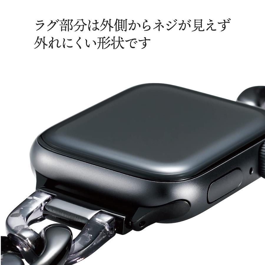 【 説明 】■ 透明樹脂とステンレスの2種類の素材を使った組み合わせが楽しめるApple Watch用ステンレスチェーンバンドです。■ 透明感のあるレジン樹脂とメタリックなステンレスという異素材の組み合わせが、シックな装いを演出します。■ バンド中央部のコマは、一つ一つがバックルとなっているため調整工具が不要で、簡単に長さの調整が可能です。■ 細身のチェーンでブレスレットのようなエレガントさがあり、結婚式やパーティなどのフォーマルシーンにも使えます。■ ステンレスバンドは水や汗に強く長い年月で使用することができます。■ Apple Watch本体カラーとマッチする、ブラックです。■ Apple Watchとバンドを接続するラグ部分は外側からネジが見えず外れにくいオリジナル形状です。■ バンドをApple Watchに装着したままで液晶画面の確認、本体の操作、各種ボタン操作、純正の磁気充電ケーブルへの設置が可能です。