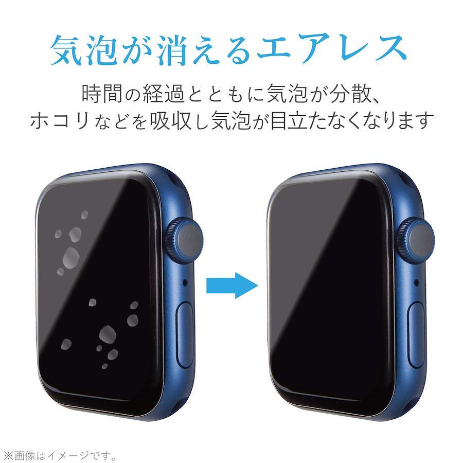 【 説明 】■ 画面の曲面に沿った3D設計で、端末のデザインを損なわずに衝撃から守るブルーライトカットタイプのApple Watch用フルカバーフィルムです。■ 非常に柔らかいウレタン素材を採用する事により、湾曲部分に追従し画面の端まで保護することができ、Apple Watch独自のデザインを損なわず、まるでフィルムを貼っていないような仕上がりになります。■ 画面の隅から隅までしっかり保護できるフルラウンド設計です。■ フレームがない透明タイプで、本体のデザインを損ないません。■ つやのある高光沢加工により、画像の輪郭がくっきり見える高光沢タイプです。■ 時間の経過とともに気泡が目立たなくなる特殊吸着層を採用したエアレスタイプです。■ 小さな気泡ができたときには、付属