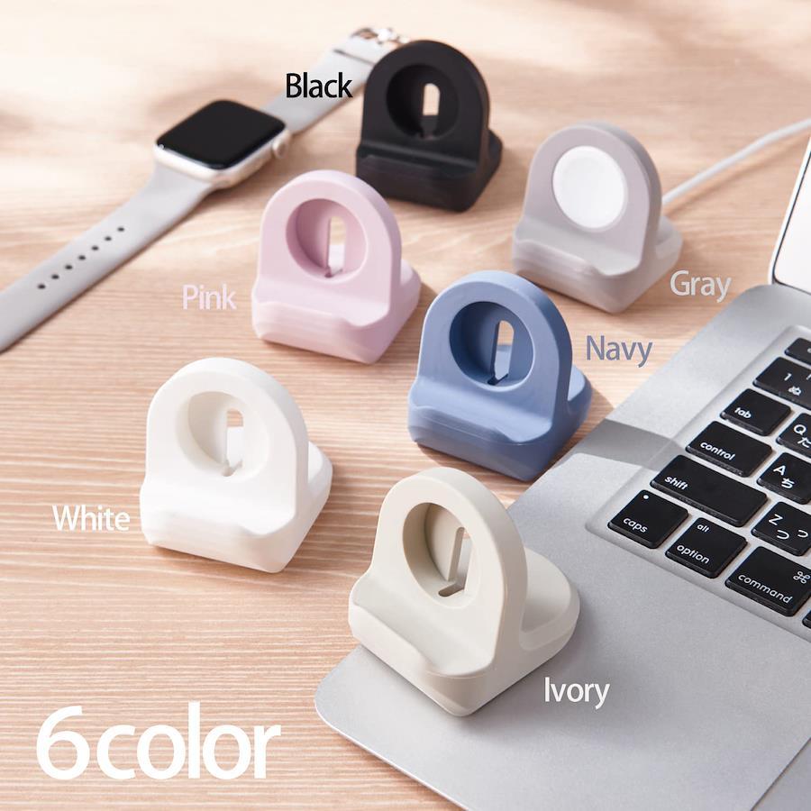 純正Apple Watch磁気充電ケーブルを装着・接続することで、Apple Watchの設置と充電ができるApple Watch用シリコンスタンドです。おしゃれなニュアンスカラーがポイントの小さなシリコンスタンドです。Apple Watch SE2、SE、Series 8、7、6、5、4、3、2、1に対応しています。スタンドはシリコンゴム製で、Apple Watch磁気充電ケーブルの脱着を簡単に行なえます。充電部の厚みが足りない純正ケーブルには、リングパーツをはめ込んだ上から充電部をスタンドへ取り付けてください。