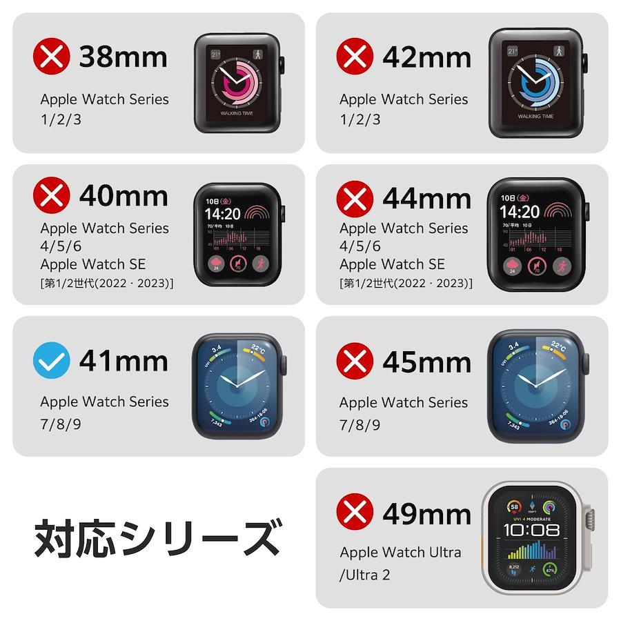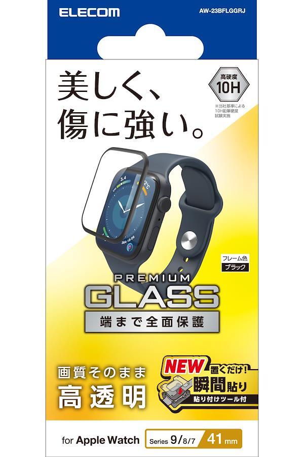 【仕様】■対応機種:Apple Watch Series 9、8、7 [41mm]■セット内容:画面保護ガラス(高透明、指紋防止仕様)×1、クリーニングクロス×1、ホコリ取りシール×1、貼り付けツール×1■材質:接着面:アクリル系粘着剤、外側:ガラス■カラー:ブラック