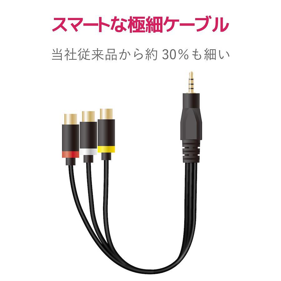 3営業日以内に発送≪新品未開封品≫:【 仕様 】■ コネクタ形状:ストレート型ミニプラグ(4極) - 映像RCAピンジャック×3メス ※ミニプラグピン配置は、先端から:音声左(白)、映像(黄)、アース、音声右(赤)■ 対応機種:AV入力用ミニジャック(4極)を搭載したテレビ等と映像RCAピンプラグx3(オス)ケーブルとの接続■ ケーブル長:0.15m■ カラー:ブラック■ 環境配慮事項:EU RoHS指令準拠(10物質)【 説明 】■ ビデオ/DVDデッキ等に接続されているお手持ちの映像RCAピンプラグ×3ケーブルに接続することで、AV入力用ミニジャック(4極)を搭載したテレビ等に接続して映像と音声を出力できるアナログビデオ変換ケーブルです。※ 4極ミニプラグの配線仕様(ピン配列)は統一されておらずメーカー・機種によって異なる場合があります。事前に接続される機器の配線仕様(ピン配列)をご確認ください。■ ミニジャック(4極)端子を搭載したシャープ製テレビ、ソニー製テレビ等に使用可能です。 その他対応モデルは製品WEBページにてご確認ください。■ RCAコネクタは約25%小型化し、ケーブルは約30%細くなり、よりコンパクトで取り回しがしやすいケーブルです。※当社従来品比■ テレビ等との接続側にスタンダードなストレート型プラグを採用しています。■ 外部ノイズに強い75Ω同軸ケーブルを使用しています。■ 高純度OFC99.99%(無酸素銅)ケーブルを使用し、信号の歪みや伝送ロスを抑えます。■ サビに強く経年劣化信号劣化を防止する金メッキ端子(24K)を採用しています。【商品に関するお問い合わせ】エレコム総合インフォメーションセンターTEL. 0570-084-465FAX. 0570-050-012受付時間 / 10