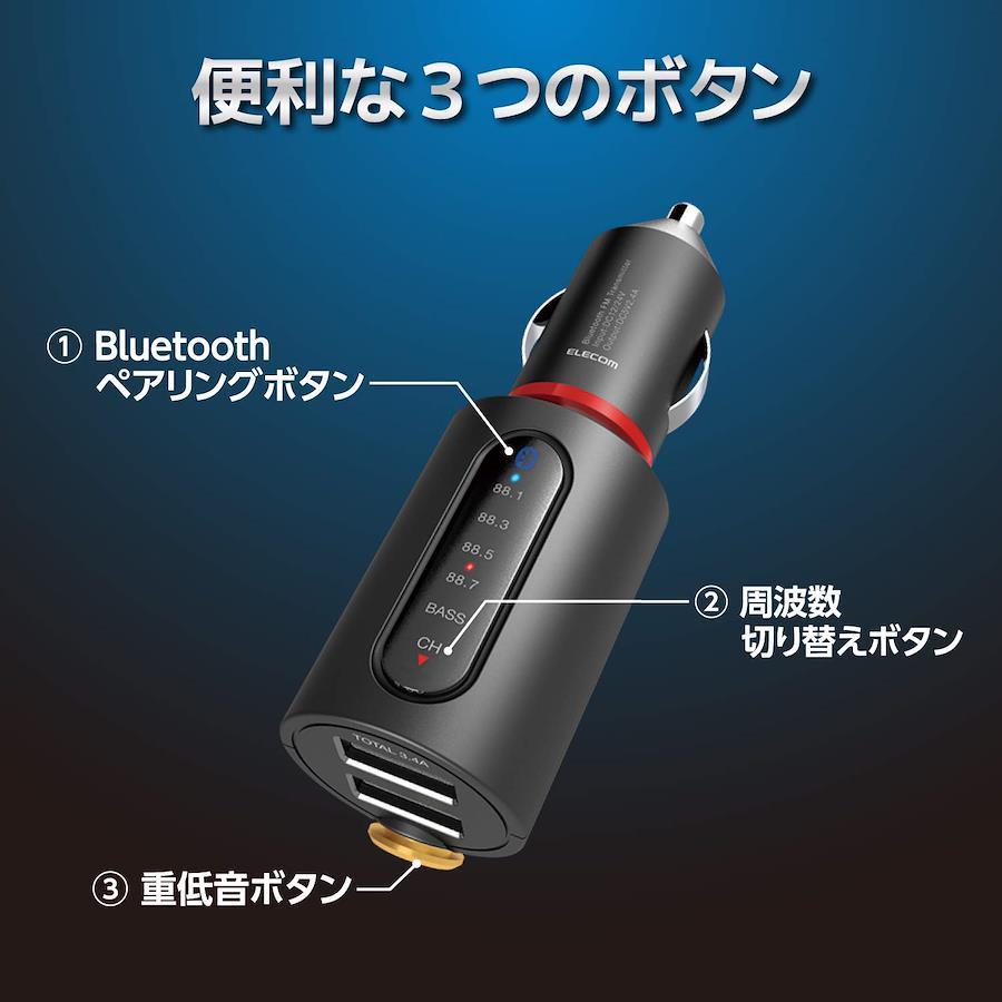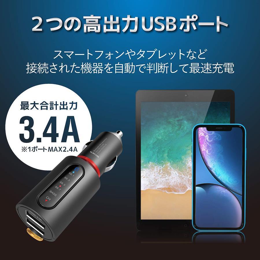 ELECOM FM Transmitter Bluetooth with 2 USB Ports 3.4A Black