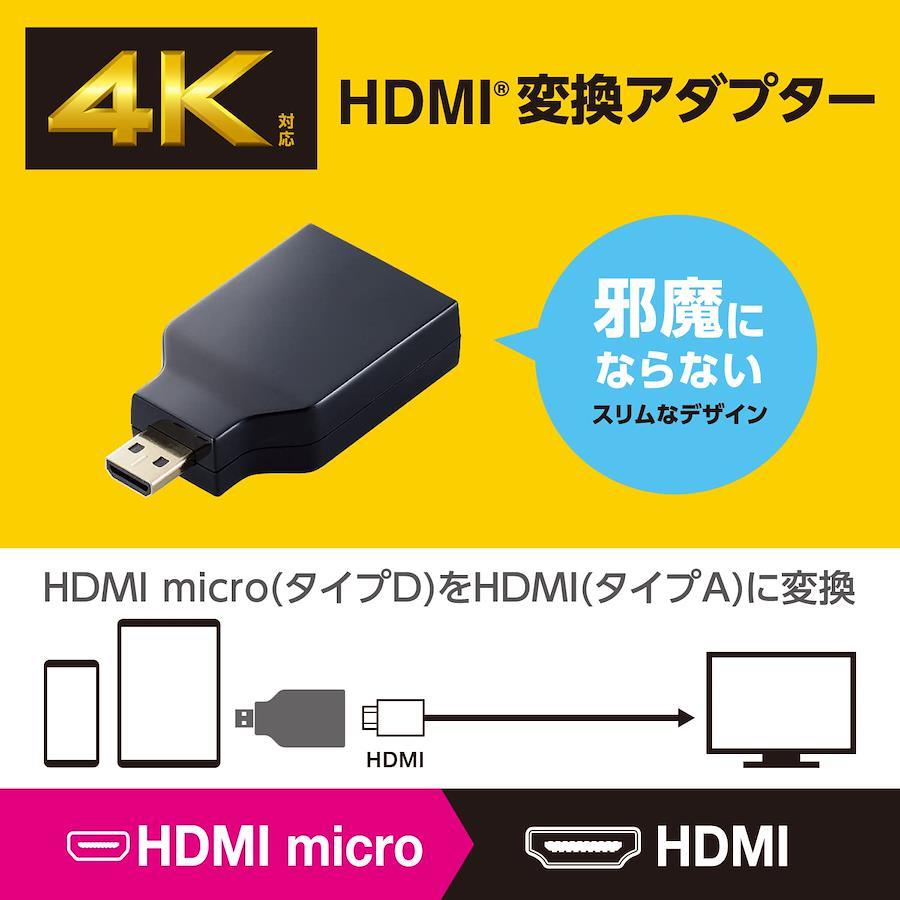 【 仕様 】■対応機種:HDMI(タイプA)ポート:HDMI(タイプA)ケーブル/HDMI Micro(タイプD)プラグ:HDMI Micro端子搭載のビデオカメラ等■コネクタ形状:HDMI(タイプA)ポート-HDMI Micro(タイプD)プラグ■カラー:ブラック■対応解像度:4K×2K(60p)対応 ※接続するケーブルの仕様によっては解像度が落ちたり映像が正常に映らなかったりする場合があります。■パッケージ形態:ブリスター+台紙