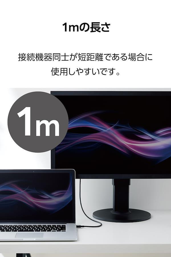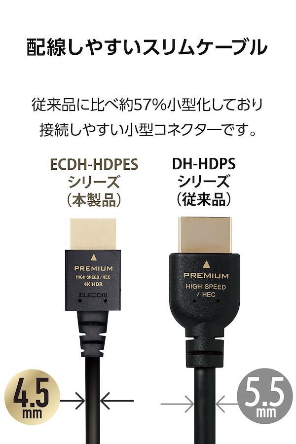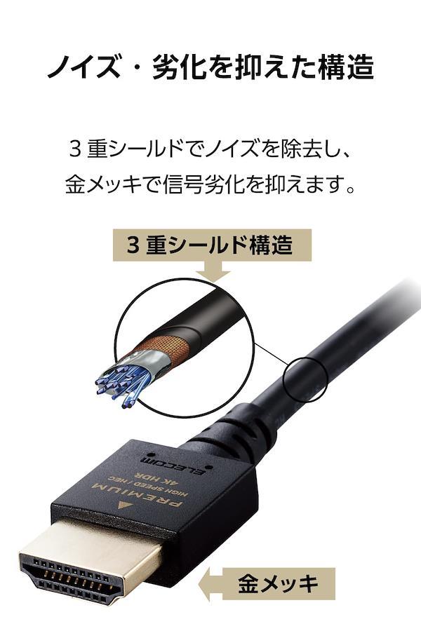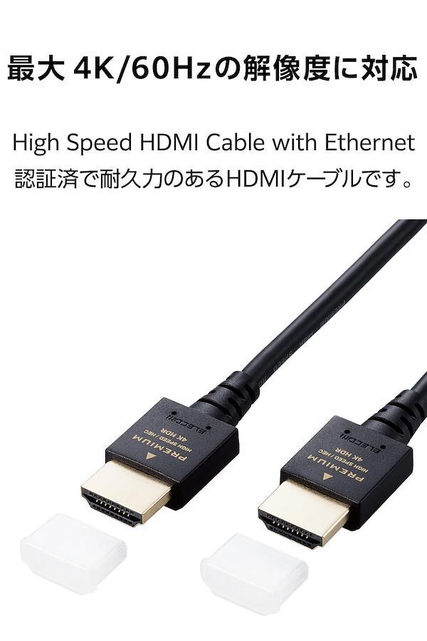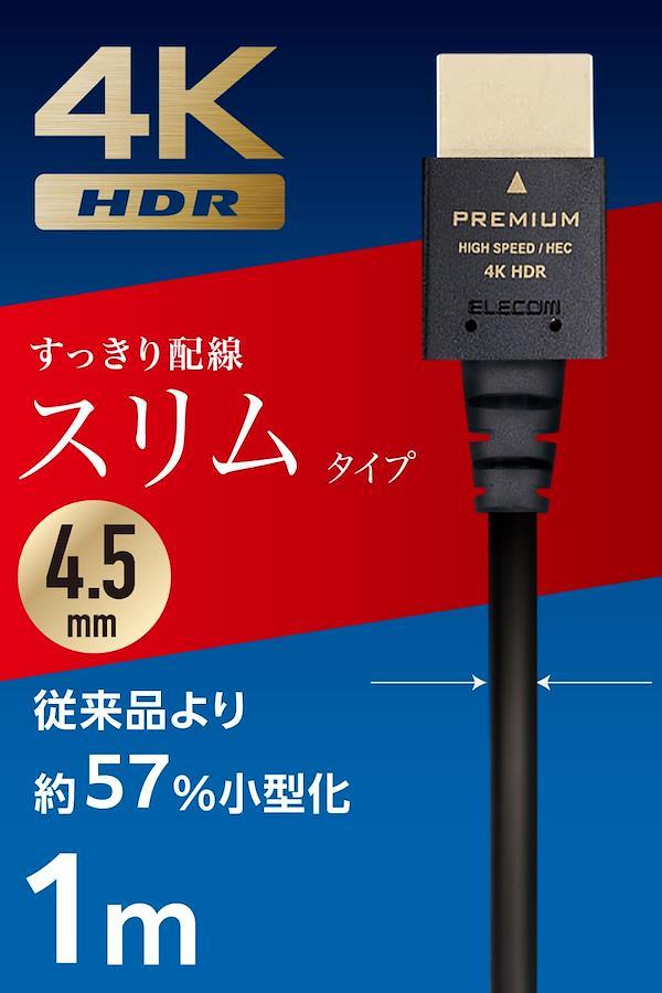 ■対応機種:HDMI(タイプA・19ピン)側:HDMI入力端子を持つ液晶テレビ、プラズマテレビ、プロジェクター等、HDMI(タイプA・19ピン)側:HDMI出力端子を持つAV機器、ゲーム機等 ■規格:Premium High Speed HDMI Cable with Ethernet (HDMI 2.0)認証 ■コネクタ形状1:HDMIプラグ(タイプA・19ピン) ■コネクタ形状2:HDMIプラグ(タイプA・19ピン) ■ケーブルタイプ:スリム ■伝送速度:18Gbps ■対応解像度:最大4K(3840×2160px)/60Hz ■シールド方法:3重シールド ■プラグメッキ仕様:金メッキピン・金メッキコネクター ■ケーブル長:約1m ※コネクター含まず ■ケーブル径:約4.5mm ■カラー:ブラック ■パッケージ形態:袋+ステッカー ■環境配慮事項: EU RoHS指令準拠(10物質)、簡易パッケージ