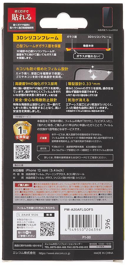 【 説明 】■ 強じんなGorilla(R)ガラスを採用。3D設計の凸型シリコンフレームが画面を保護し角割れを防ぐ、iPhone 12 mini用フレーム付き液晶保護ガラスです。■ 3D設計の凸型シリコンフレームにより、画面を下に向けて置いてもガラスが触れず、ガラス面を保護します。■ ガラス交換1年保証付き製品です。■ 本製品をご使用の際に、フィルムの角が「欠けた」、「ヒビが入った」、「割れた」場合、ご購入より1年以内に申請いただくことで、フィルムの交換が1回可能になるサービスです。※ 詳しくは、同梱の説明書またはQRコードにてご確認ください。■ 表面硬度9Hの強化ガラス採用により、保護ガラス表面のキズを防止します。※表面硬度は実力値です。■ 貼り付け面にシリコン皮膜をコーティングし、接着剤や両面テープを使わずに貼り付け可能な自己吸着タイプです。貼りやすく、貼り直しも可能です。■ 時間の経過とともに気泡が目立たなくなる特殊吸着層を採用したエアーレスタイプです。■ 特殊な飛散防止設計により、万一割れてしまった際にもガラス片が飛散することなく、高い安全性を実現しています。■ 指紋・皮脂汚れが付きにくく、残った場合でも簡単に拭き取れる指紋防止加工を施しています。■ 端末の形状に合わせたサイズにカット済みなので、パッケージから取り出してすぐに使用可能です。■ フィルムを貼ったままでも本体操作ができるタッチスクリーン入力に対応しています。■ 受話口に防塵処置を実施し、究極までカバーする極み設計を施しています。
