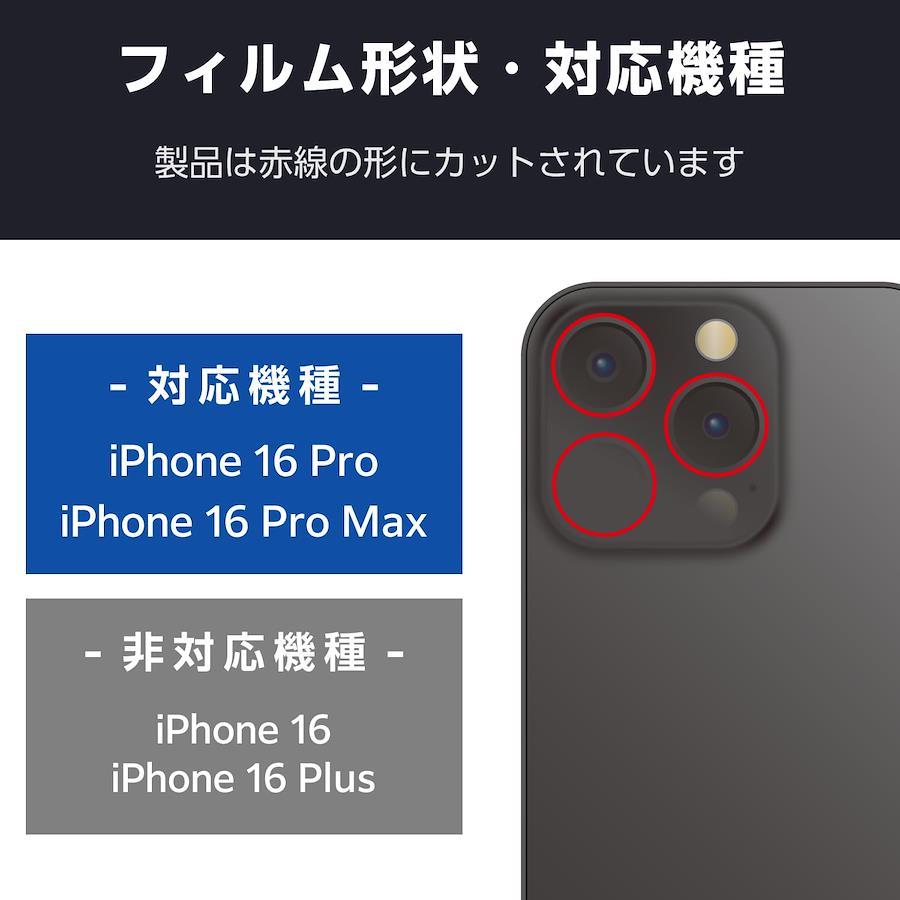 【仕様】■対応機種:iPhone 16 Pro、iPhone 16 Pro Max■セット内容:カメラレンズ保護ガラスフィルム×3、クリーニングクロス(乾式)×1、ホコリ取りシール×1、貼り付けツール×1■材質:接着面:アクリル系粘着剤、外側:ガラス・アルミ合金■カラー:ブラック