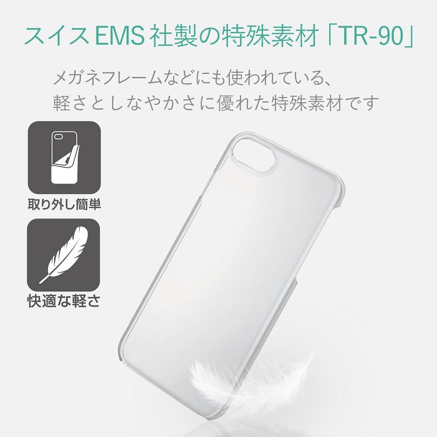 ■割れに強い「TR-90」を採用!薄型・軽量設計でありながらしなやかな強さを実現したiPhone 8、iPhone 7用フレックスシェルカバーです。 ■薄型・軽量設計でありながら割れに強く、安心して装着することができるフレックスシェルカバーです。 ■スイスEMS社製 「TR-90」を採用しています。 ■「TR-90」は、メガネフレームなどにも採用されている、軽量かつ柔軟性に優れた素材です。 ■薄さ1.0mmで保護性能とスリムさを兼ね備えた最適設計です。 ■柔軟性に優れているので、カバーの取り外しが簡単に行えます。