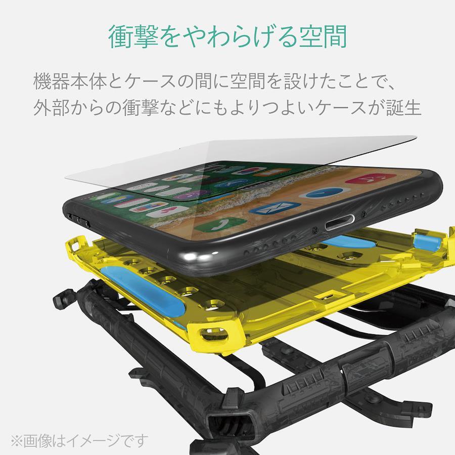 iPhoneとケースの間に空間を設けた中空構造を採用しています。実機を浮かせるように配置することで、外部からの衝撃、振動を吸収、緩和します。