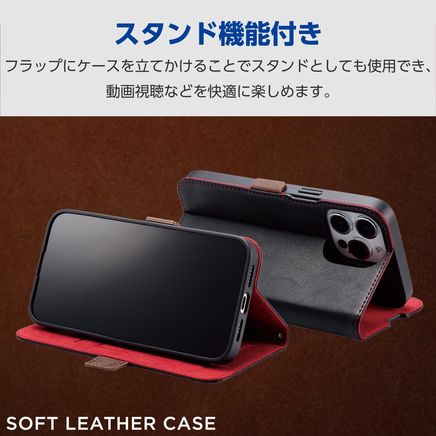 便利な機能を搭載した、革のようなやわらかな風合いのソフトレザーケース(手帳型)です。