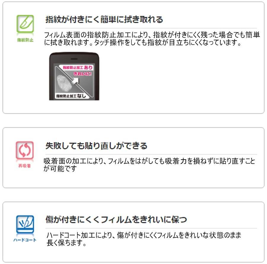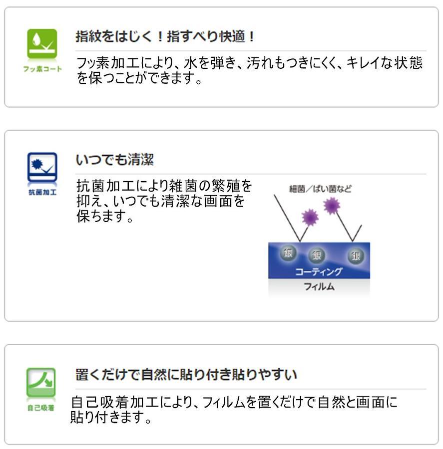 iPhone 7用の液晶画面を守り、指紋・皮脂が付きにくく、残った場合も簡単に拭き取れる指紋防止タイプの液晶保護フィルムです。時間の経過とともに気泡が目立たなくなる特殊吸着層を採用しています。小さな気泡ができたときには、指などで押し出すことで気泡を抜くことができます。つやのある高光沢タイプで、液晶画面を鮮やかに彩ります。指紋汚れを付きにくくする指紋防止コーティングを施しています。フィルムに抗菌機能を施し、細菌の繁殖を防ぎます。