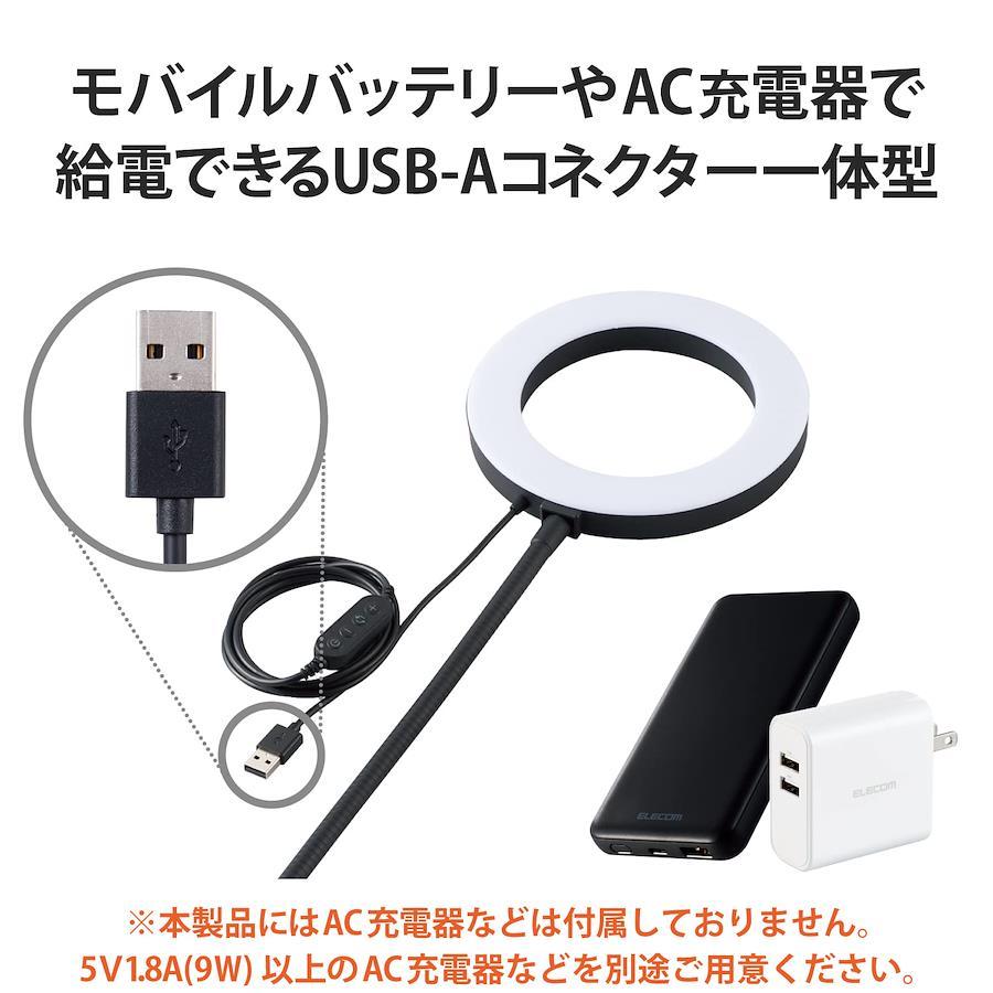 ■接続端子はUSB-Aコネクターを採用、手持ちの5V/1.8A以上のAC充電器やモバイルバッテリーで使用が可能です。