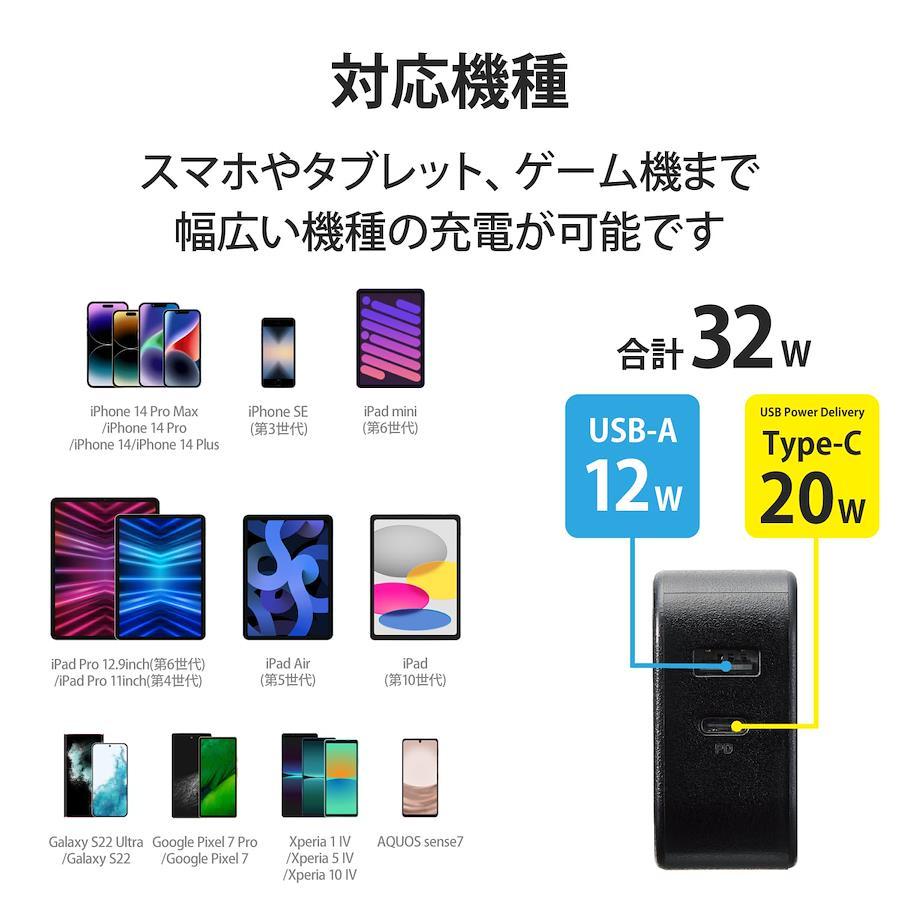 ■ 定格出力電力:合計32W(USB Type-C(TM)(USB-C(TM)):20W + USB A:12W)