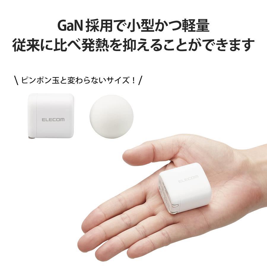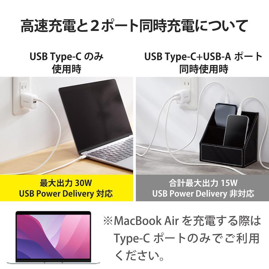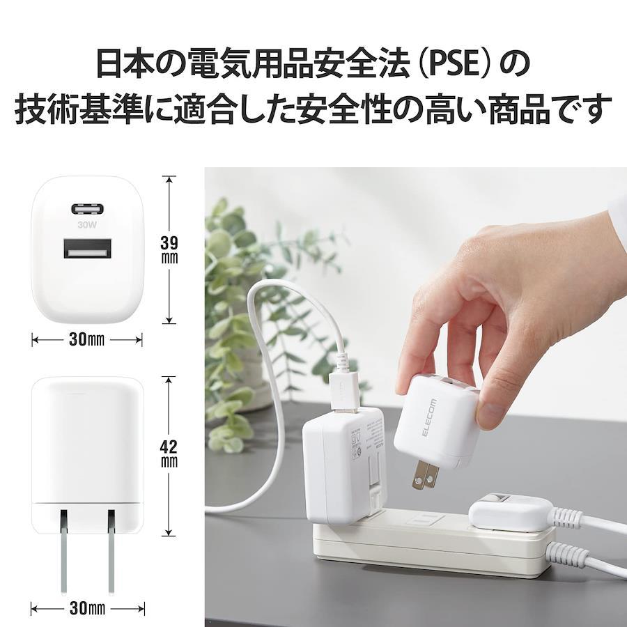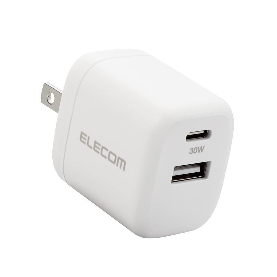 【説明】■USB Type-C(TM)(USB-C(TM))ポートとUSB-Aポートの合計2ポートを搭載し、GaN(窒化ガリウム)を採用した小型で軽量、かつ高出力なUSB AC充電器です。■USB Type-C(TM)ポートは、USB Power Deliveryに準拠し対応するノートパソコンやスマートフォン、タブレットなどを超高速充電が可能です。■USB-Aポートは最大出力12W(5V/2.4A)で、“おまかせ充電"に対応しています。■GaN(窒化ガリウム)とは従来のシリコンと比べると発熱を抑える事が出来る新材料で、製品の小型化及び軽量化が可能となりました。■手のひらにすっぽり隠れるほど小さく(約42mm×30mm×39mm)、軽量(約58g)なので外出や出張などの際の持ち運びに便利です。■USB Power Delivery(パワーデリバリー)とは、アダプターと接続機器間で情報をやり取りすることで、その機器間における最適な電力を選択し、高速充電を実現するUSB規格です。■※本製品の最大出力は30Wです。■端末に応じて出力が5V/3A、9V/3A、15V/2A、20V/1.5Aと可変し、iPhoneなどのスマートフォンから、iPad Airなどタブレット端末、MacBook Airなどのノートパソコンまで幅広く高速充電できます。■※USB Power Delivery 30W充電に対応した機種に限ります。■USB-Aポートは、最大出力12W(5V2.4A)でスマートフォンやタブレットなどを充電、給電ができます。■接続された機器を自動検知し、最適電流で充電できる“おまかせ充電"に対応しています。■出力端子が2ポートありますので、スマートフォンなどを2台同時に充電が可能です。■※2ポート同時出力時は合計最大15Wとなります。(USB Power Delivery での出力はできません)■スマートフォン等に付属もしくは対応する充電用USBケーブルを使用して充電可能です。■※本製品に充電用ケーブルは付属していません。■未使用時は電源プラグを折りたたんで充電器本体に収納可能です。スッキリとコンパクトに収納できるので、持ち運びにも便利です。■耐トラッキング性の要求事項(PSE:電気用品安全法)を満足したコンセントプラグを採用しています。■※本製品にケーブルは同梱しておりません